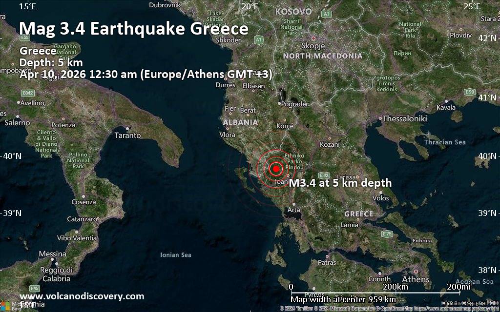 Just 9 minutes ago, a 3.4-magnitude earthquake struck near Ioannina, Epirus, Greece. The tremor was recorded after midnight on Friday, April 10th, 2026, at 12:30 am local time, at a very shallow depth of 5. km below the surface.
