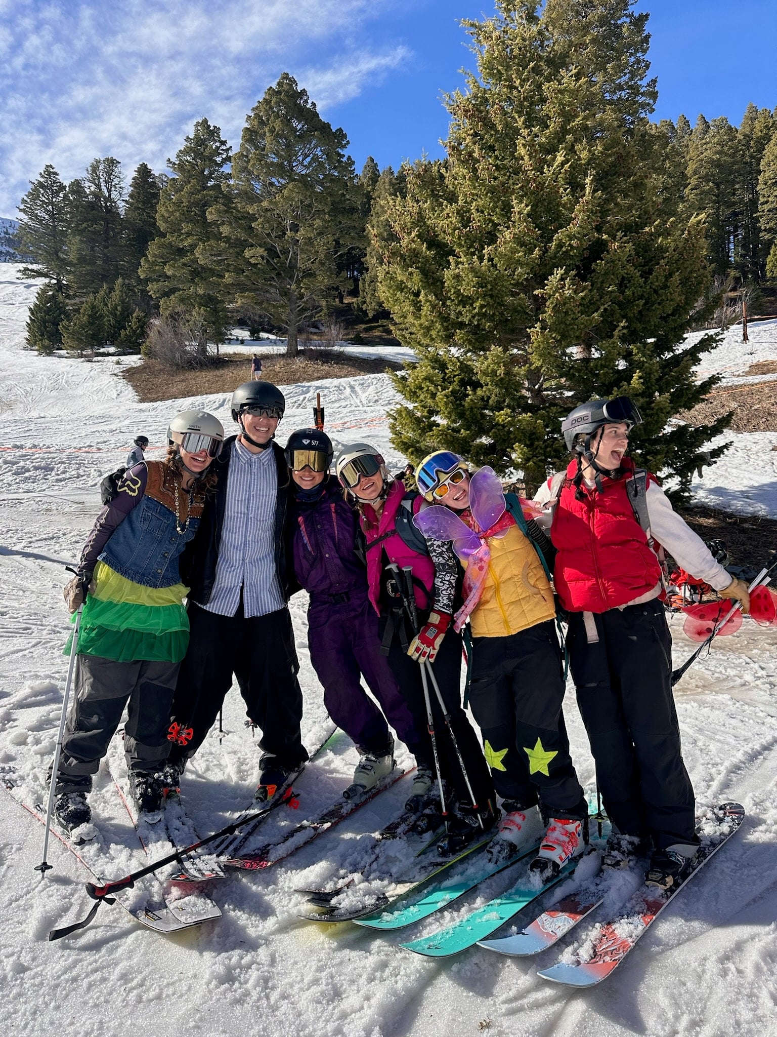 When the sun comes out on the slopes, so do the personalities. Shorts, tutus, and butterfly wings are all classic outfits that can be seen on a sunny spring day. This is one of my favorite parts of spring skiing, putting on something funny and usually coming home with an awkward tan.