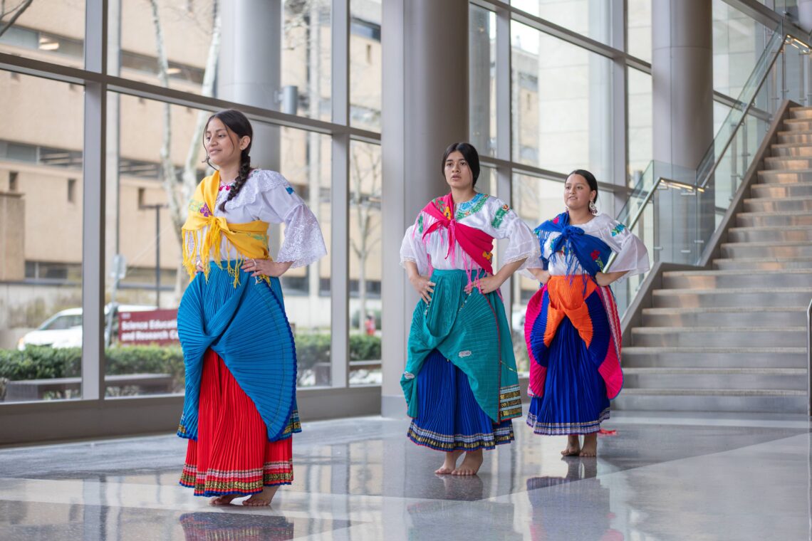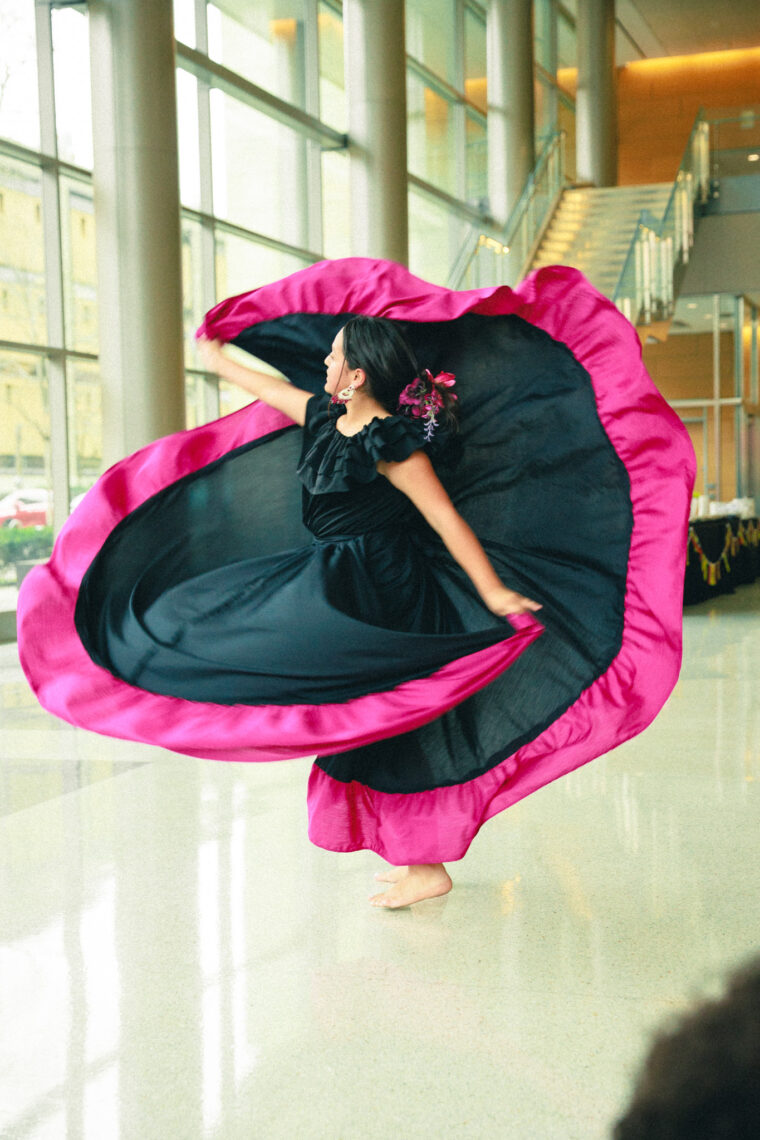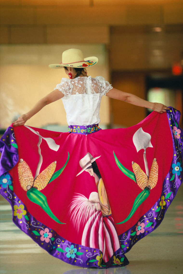 Karen Barba-Castro gracefully walked down the staircase in the Science Education Research Center’s lobby Friday afternoon, dressed in a pink and purple pollera, lace blouse, bold flower earrings, a patterned shawl and an embroidered straw hat. Before her, 25 models and performers displayed elements of vibrant Ecuadorian culture.