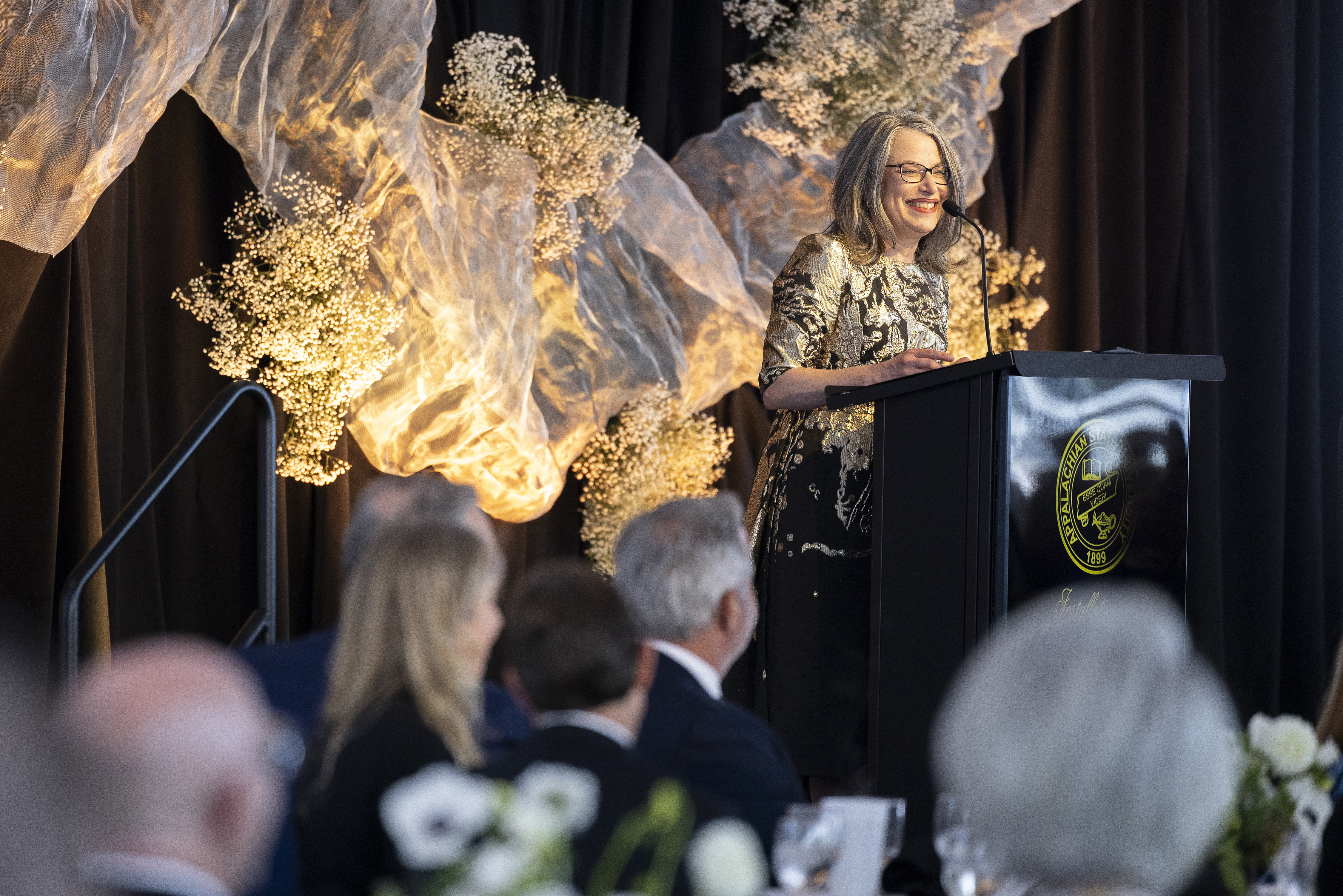 App State Chancellor Heather Norris addresses guests during her installation luncheon, wearing a dress designed by Dr. Anthony Wilson ’97 ’06. Photo by Kyla Willoughby