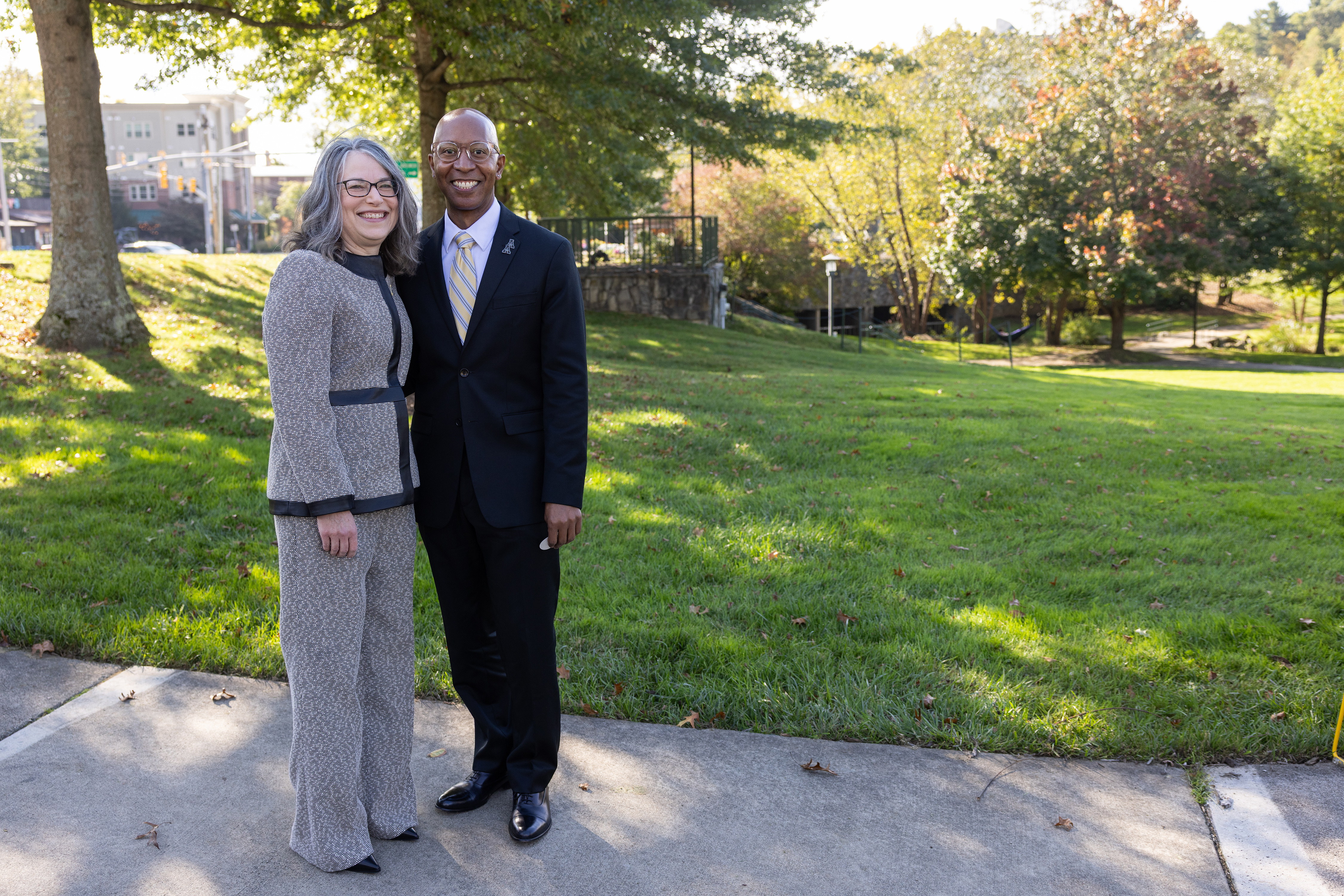 Dr. Anthony Wilson ’97 ’06, right, with App State Chancellor Heather Norris during Founders Day 2025, during which Norris wore an outfit designed by Wilson. Photo by Chase Reynolds