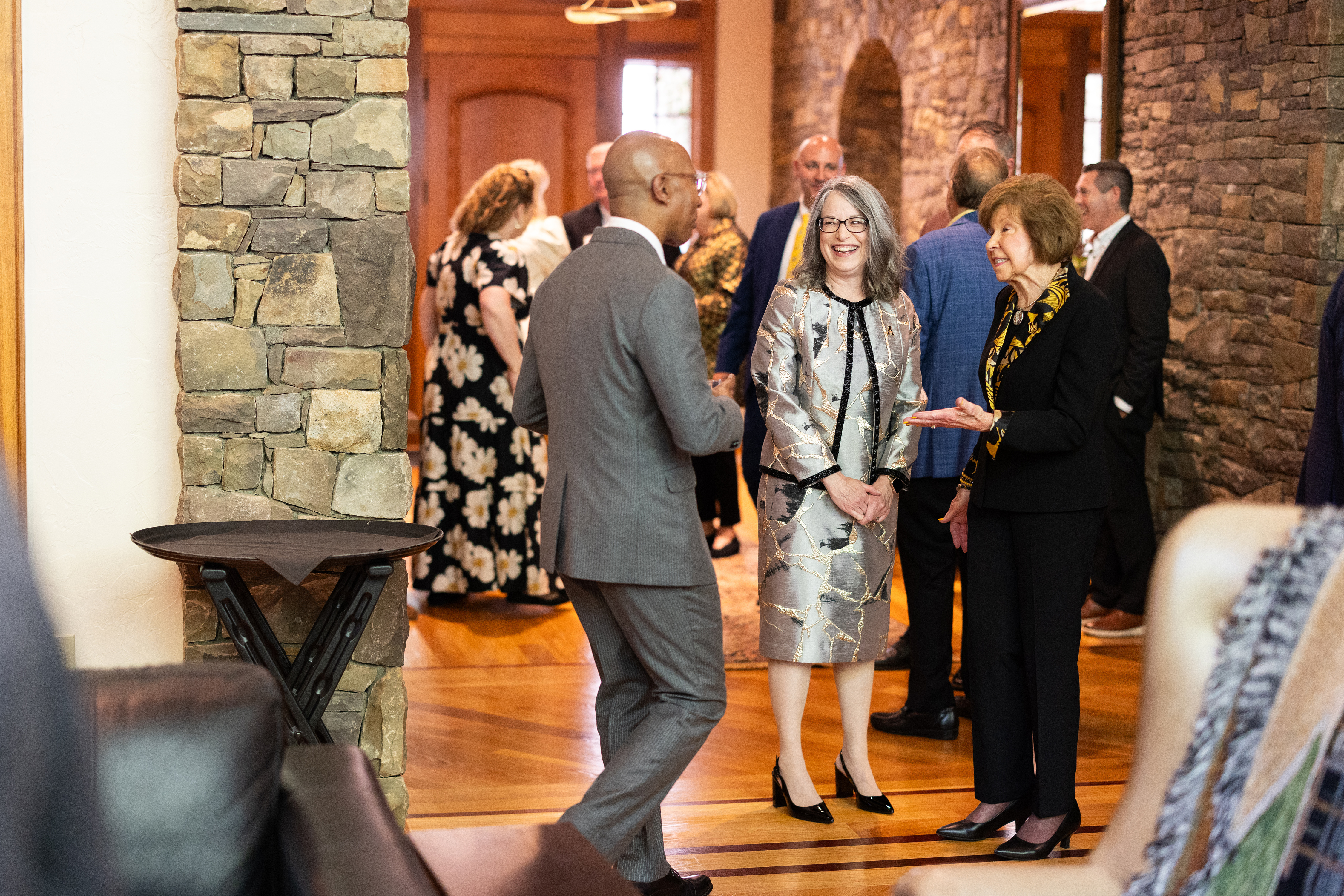 Pictured from left to right in the foreground: Dr. Anthony Wilson ’97 ’06, App State Chancellor Heather Norris and App State alumna Julia Adams ’56, aka “Ms. Yosef,” at the VIP reception for Norris’ installation as App State’s eighth chancellor, held Oct. 3, 2025. Norris is wearing a dress designed by Wilson. Photo by Chase Reynolds