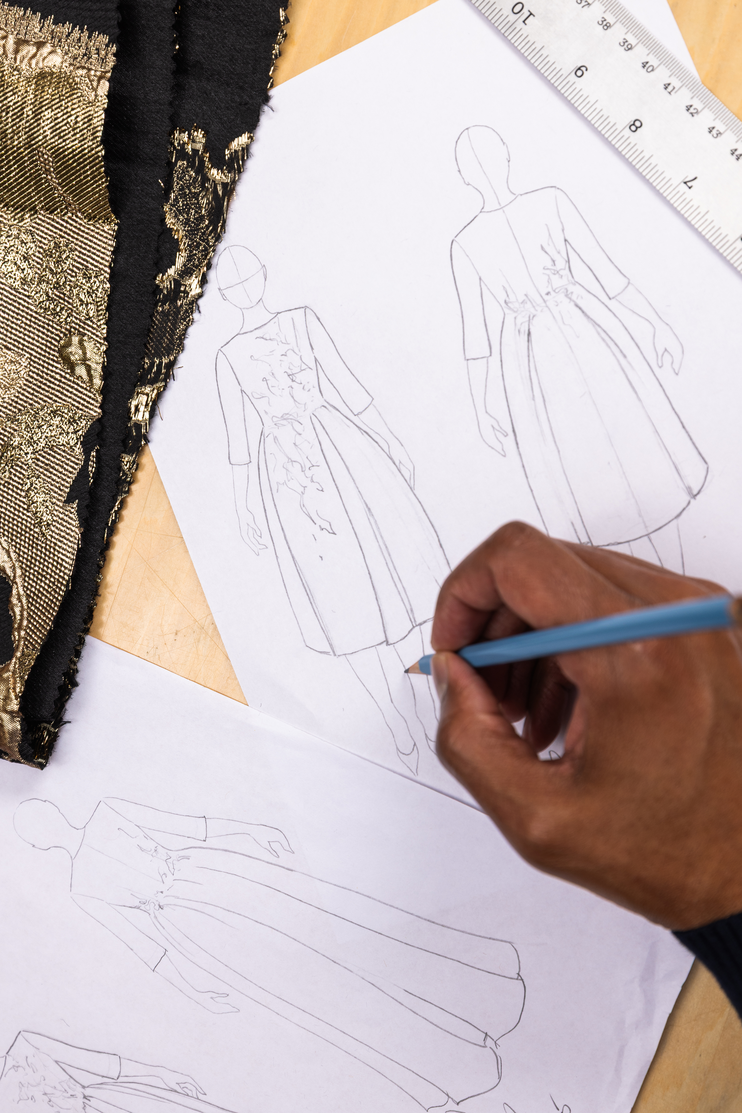 Dr. Anthony Wilson ’97 ’06 works on a series of sketches for the apparel he designed for App State Chancellor Heather Norris to wear during her installation ceremony, held Oct. 3, 2025. He developed the designs over a six-month period — a process that included sketches, measurements, selecting fabrics, sewing and fit corrections. Photo by Chase Reynolds