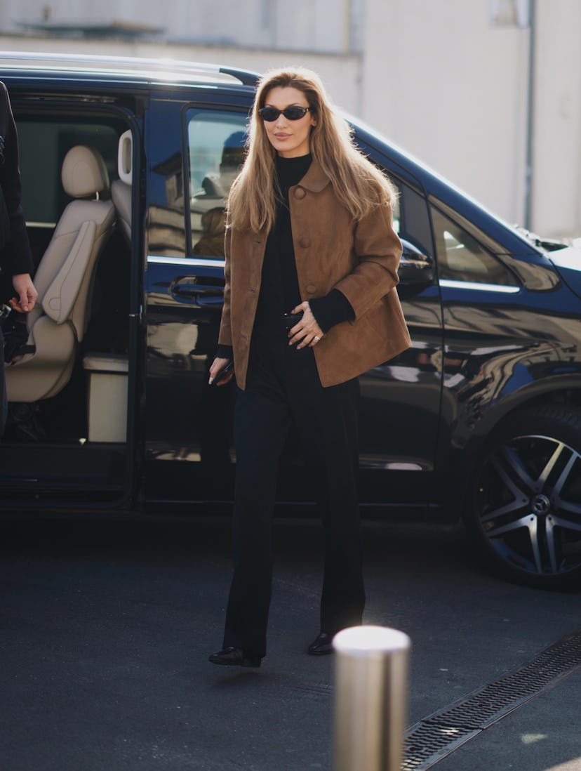 Another Milanese moment in Prada for Ms. Hadid, this time in a classic Prada jacket with a rounded collar and cropped fit. Do as Bella does and keep the rest of the outfit black when wearing a tan suede piece, and pick something up with no zipper so the button styling can be your playground every time you wear it. (We’d also suggest buttoning it all the way up and wearing it atop a slip dress.)