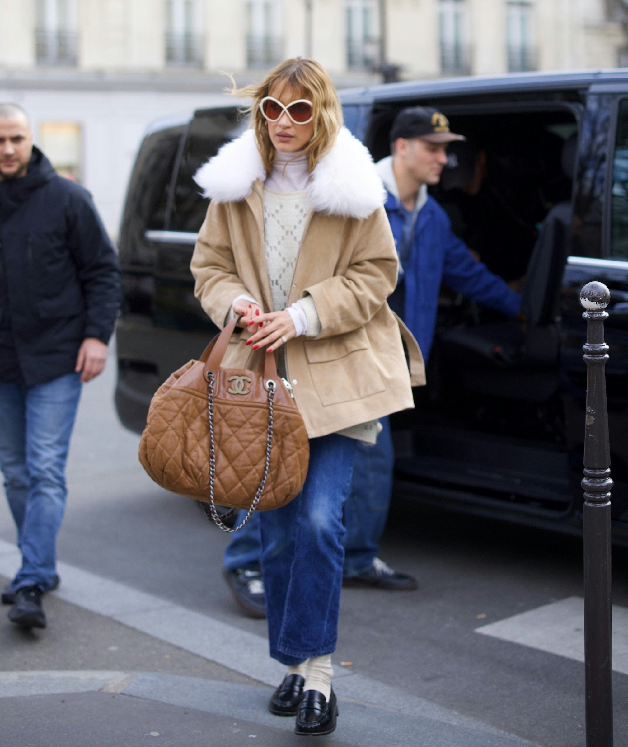 Another Milanese moment in Prada for Ms. Hadid, this time in a classic Prada jacket with a rounded collar and cropped fit. Do as Bella does and keep the rest of the outfit black when wearing a tan suede piece, and pick something up with no zipper so the button styling can be your playground every time you wear it. (We’d also suggest buttoning it all the way up and wearing it atop a slip dress.)