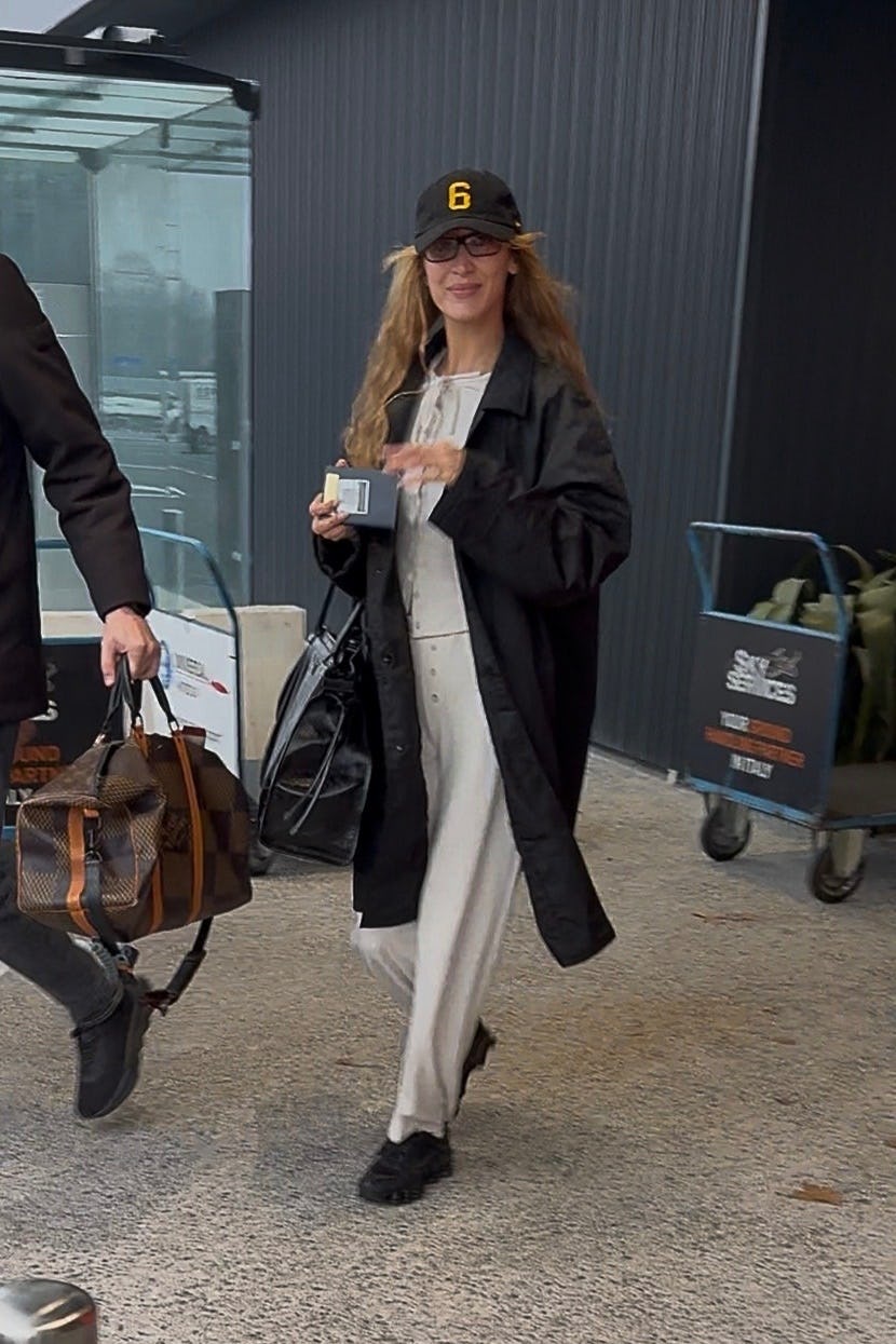 Traveling internationally is already a logistical headache, which Hadid knows, so for her plane ‘fit, she threw on a nylon trench coat that can be squished into the tiniest of overhead bins or smushed under the seat in front of her. Not only is it convenient, but it’s an all-weather piece that will have you covered should the weather turn gray and rainy in Milan or Paris.