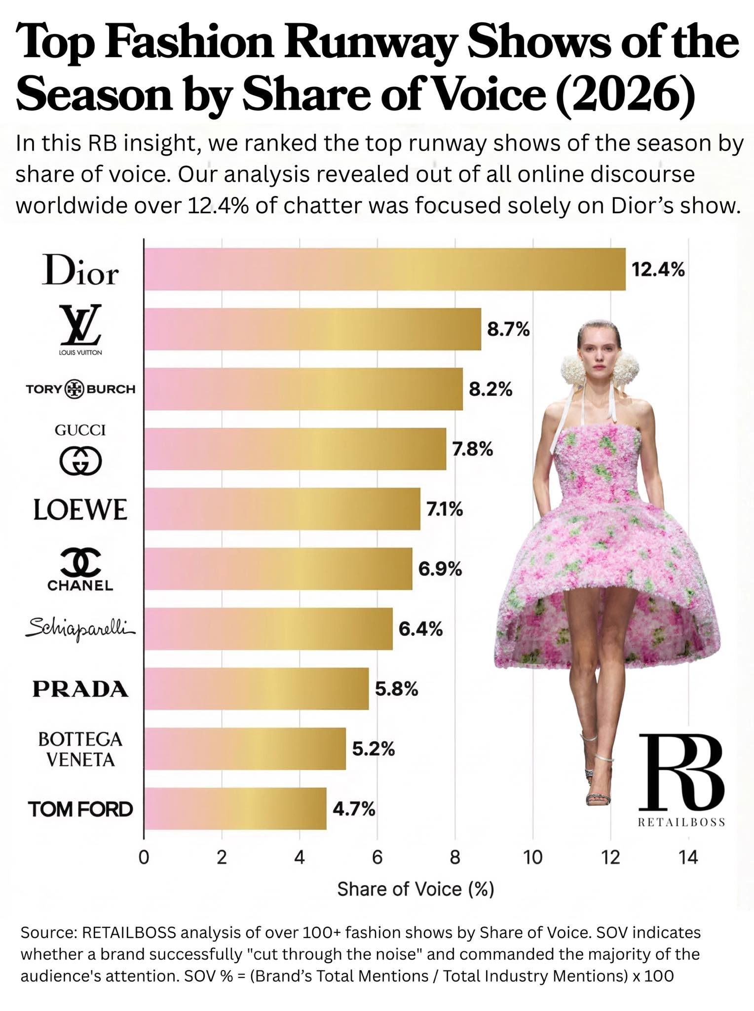 Not every runway show generates the same cultural weight and the numbers prove it. In this RB insight, we track Share of Voice (SOV) as one of the most telling metrics in fashion show rankings. It measures how much of the global fashion conversation a brand owned during the 2026 season, not just how many likes a post received, but total media presence across social mentions, editorial coverage, and influencer activity, expressed as a percentage of the entire industry’s discourse. It’s the difference between being loud and being dominant.