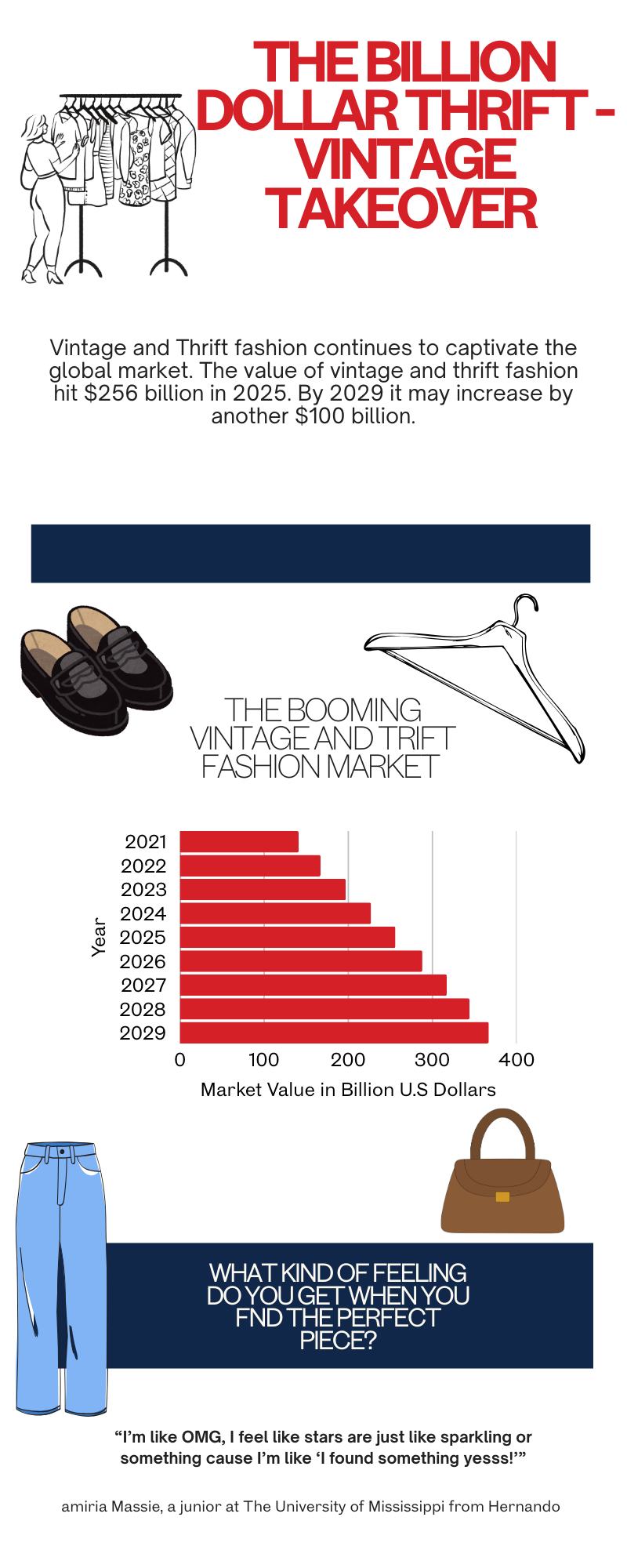 Throughout the years, vintage and thrift shopping have significantly increased in market value. Research from the resale company ThredUp and GlobalData shows the estimated value of secondhand and resale apparel is $256 billion, and that number is predicted to grow by $100 billion through 2029.