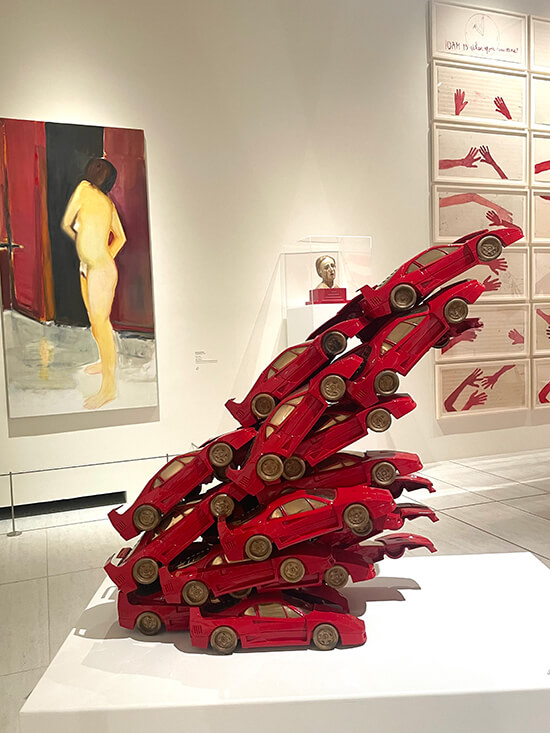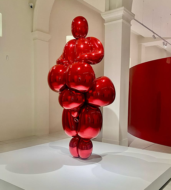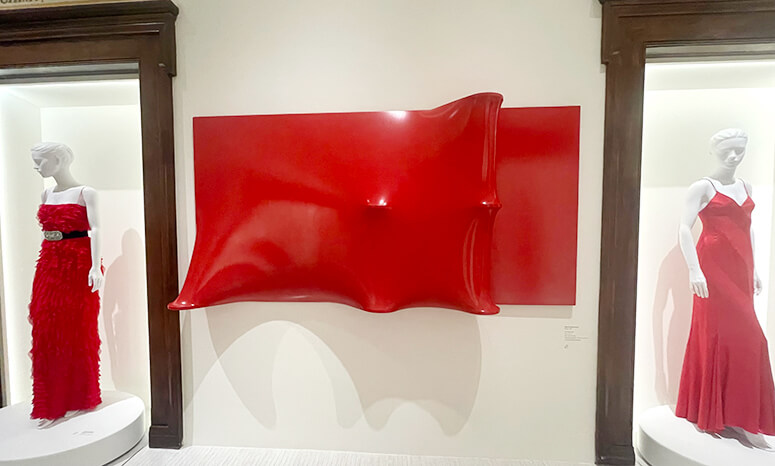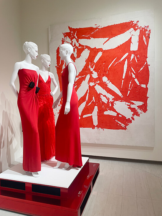 Orizzonti Rosso paid homage to red, a color Valentino associates with beauty, passion and life. Valentino is said to be “the only fashion couturier to have created a red oeuvre within his body of work, making red a constant reference point throughout his career.” The exhibit opened with the towering red sculpture Balloon Venus Lespugue by Jeff Koons. The next eye-catching piece of art was the famous Valentino portrait taken by Andy Warhol, based on a Polaroid photo taken by the artist.