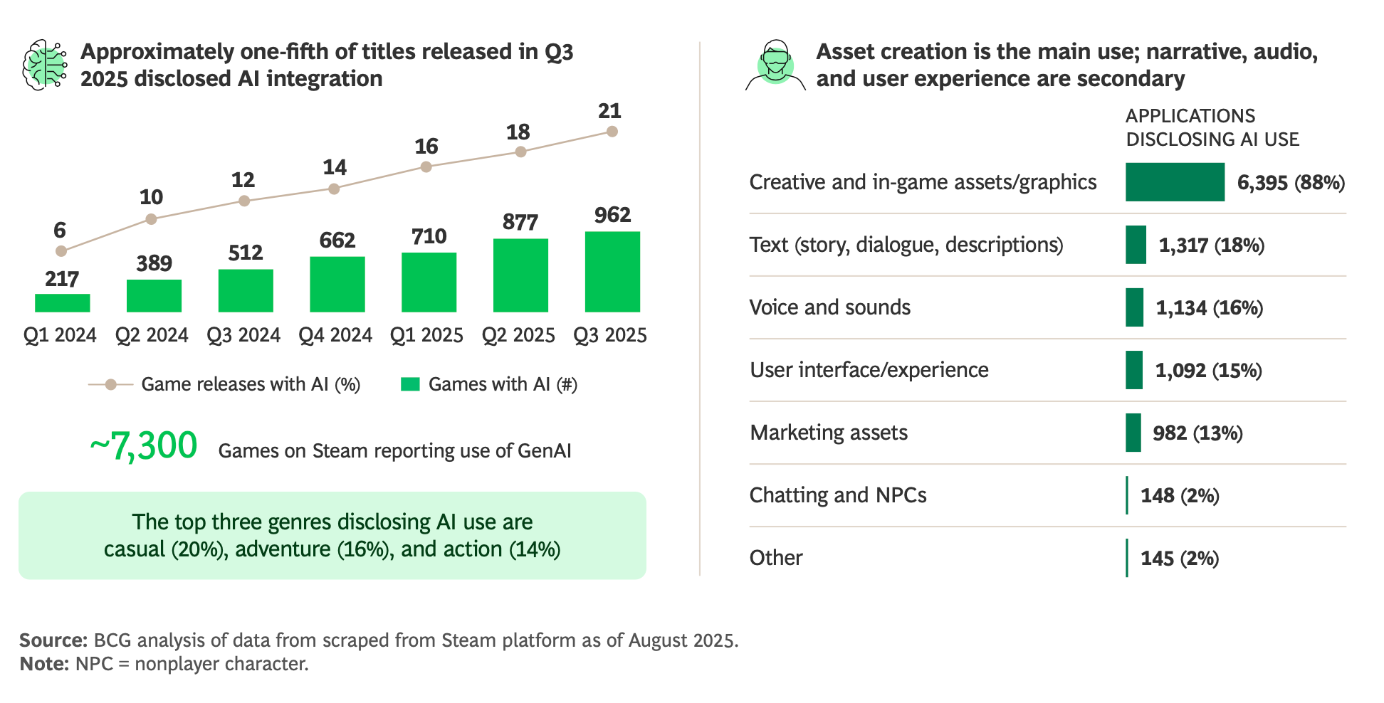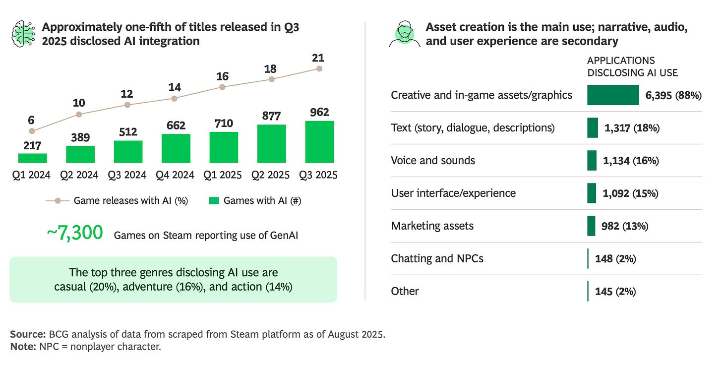 Around 7,300 games on Steam mentioned the use of AI as of August 2025. The chart shows that the share of such projects is growing and has reached 21% in Q3 2025.