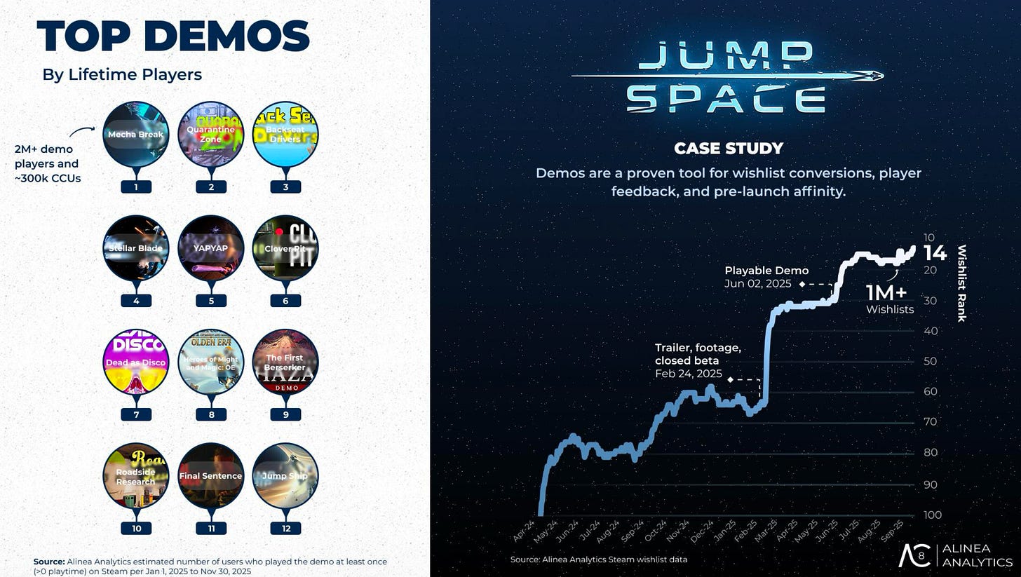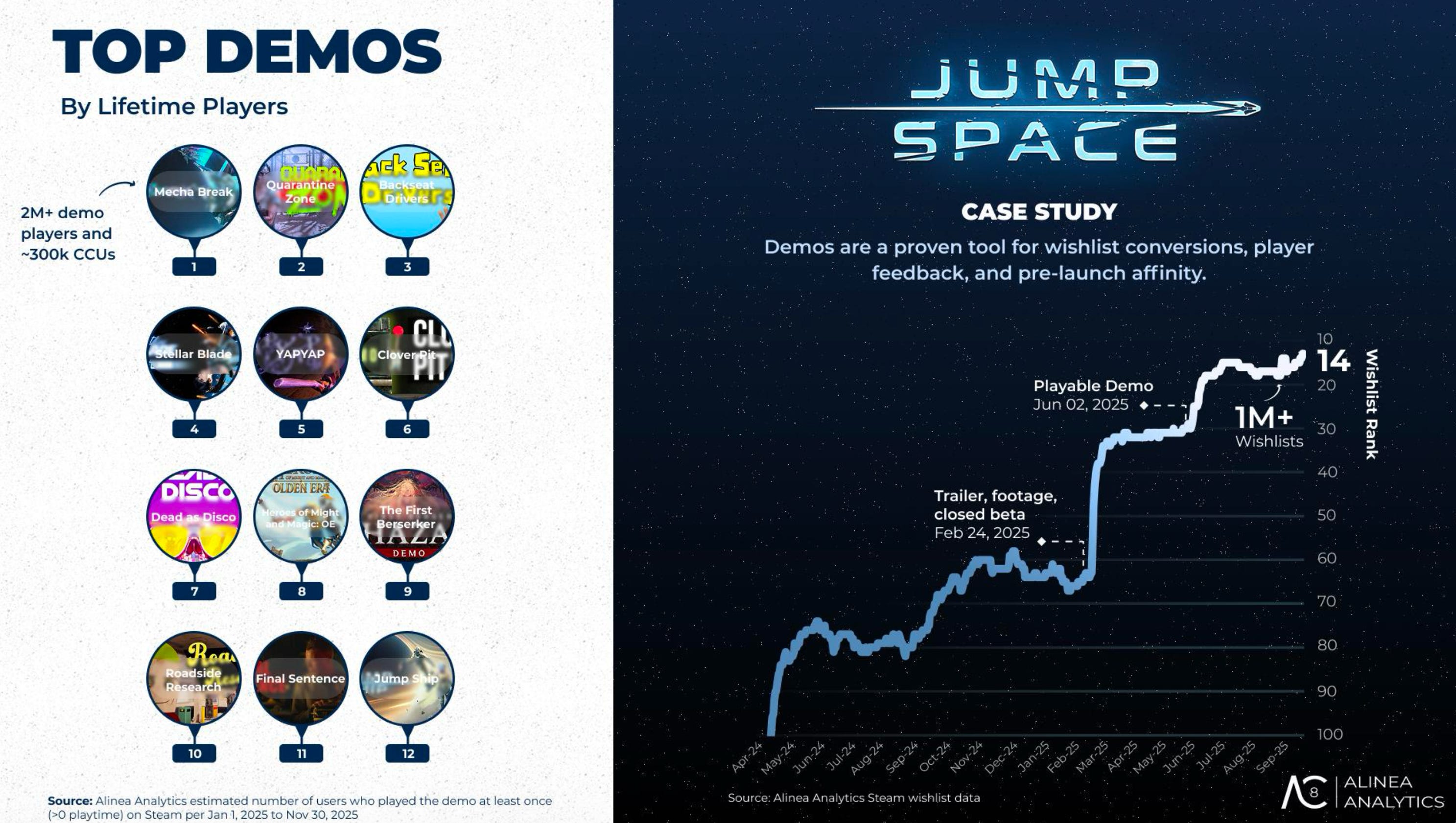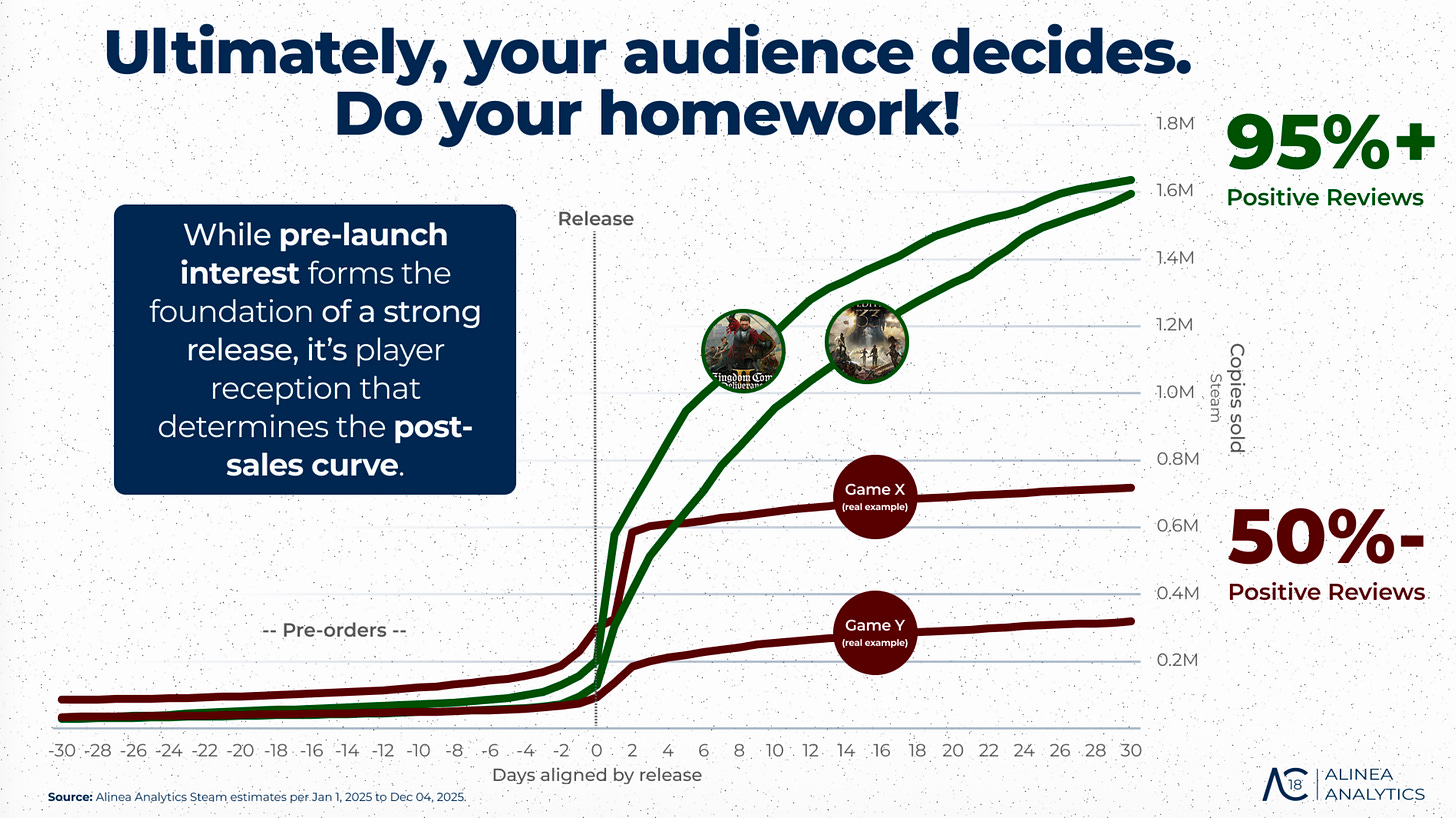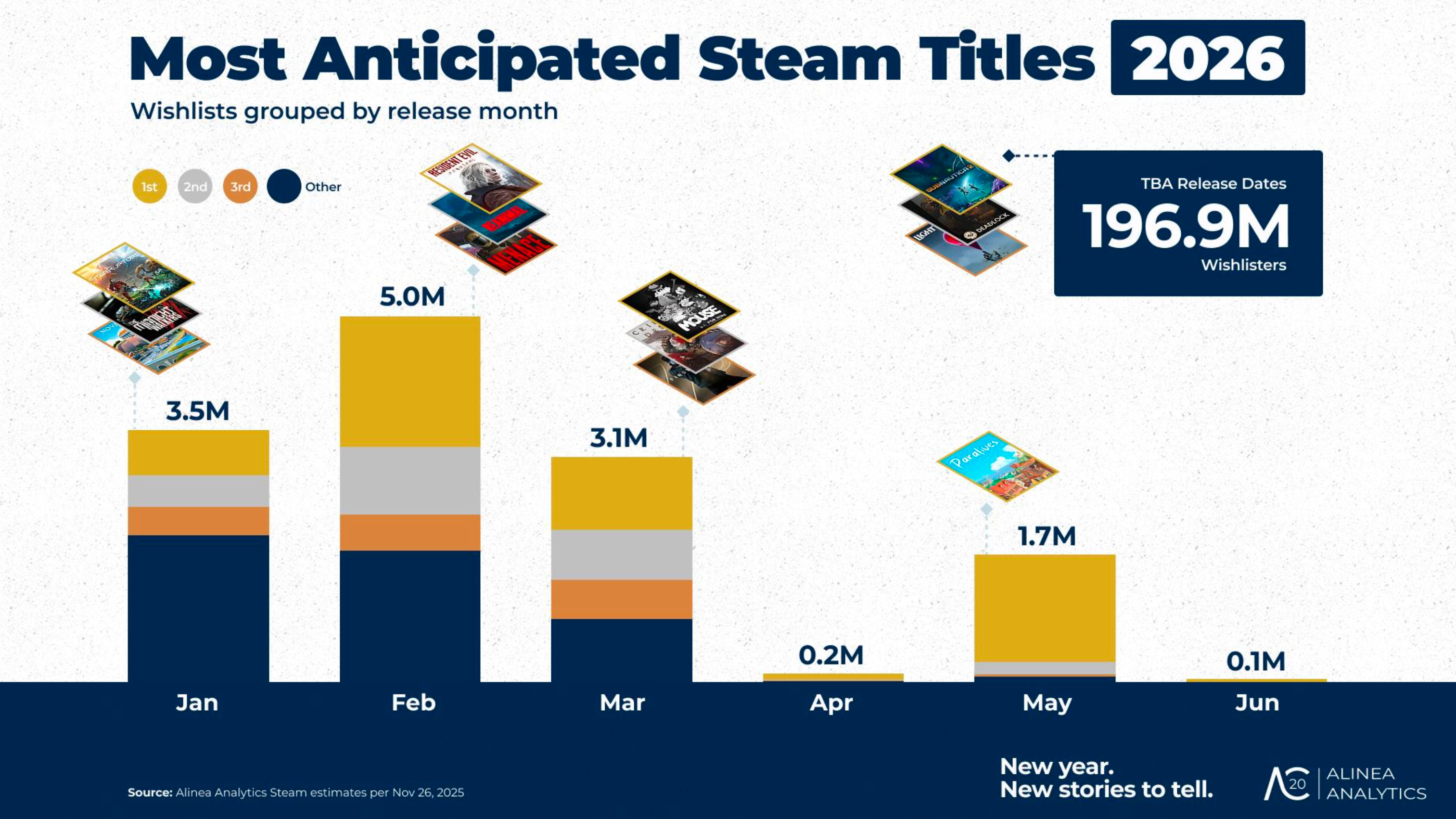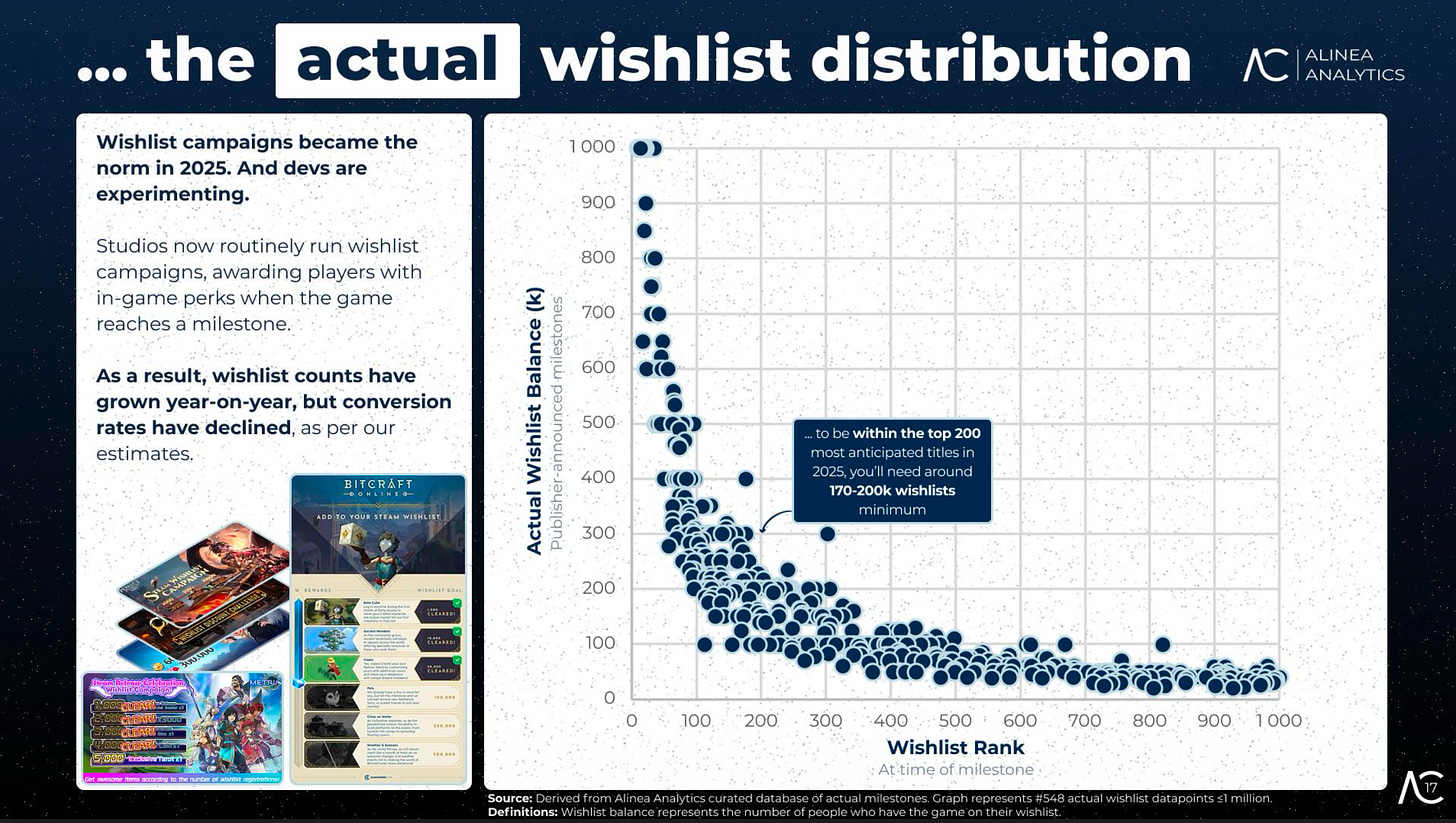 In 2025, entering the top 200 most anticipated projects required at least 170k to 200k wishlists. In addition, Alinea Analytics estimates that wishlist-to-sales conversion is declining.