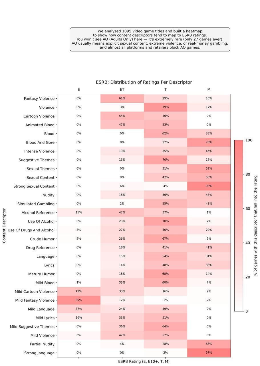 A friend of mine put together a heatmap showing which content categories lead to specific age ratings. I hadn’t come across this kind of breakdown before, so I’m happy to share this exclusive material. The study analyzed 1,895 games.