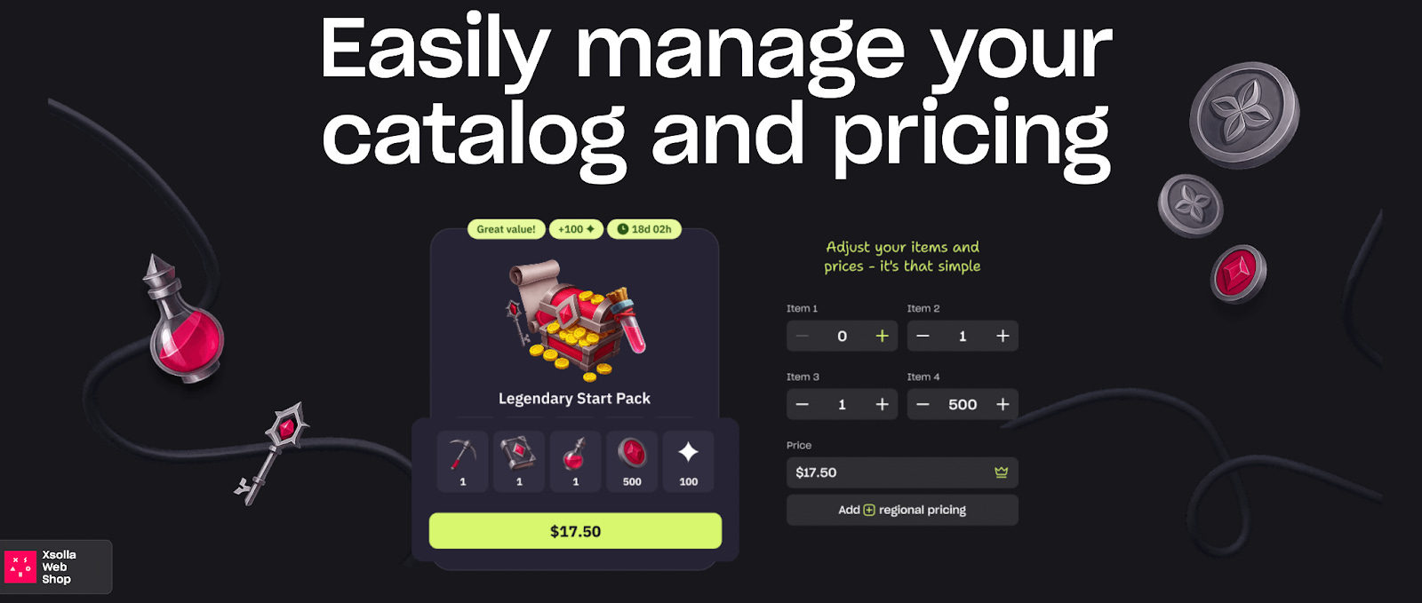 Manage thousands of SKUs easily with Xsolla’s Catalog Management – import via JSON or API, apply bulk edits and filters, and set intelligent regional prices and restrictions that match local purchasing power. This flexible pricing boosts sales by up to 13%, ensures consistency across platforms like App Store and Google Play, and cuts your operational costs by up to 50%, maximizing your global revenue.