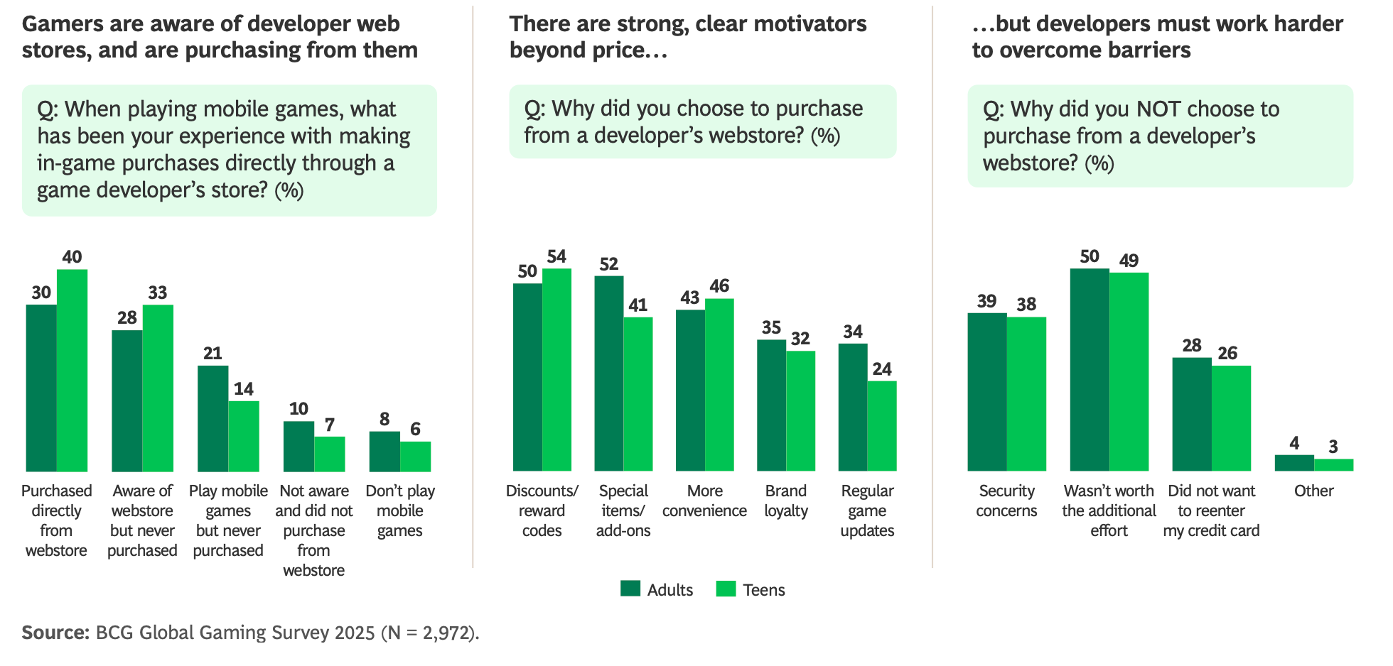 33% of adults and 40% of teenagers have already purchased games directly via developers’ web stores. The main motivations are discounts, bonuses, and exclusive items, as well as a desire to show brand loyalty. However, users are concerned about additional steps (such as re-entering card details) and security risks.