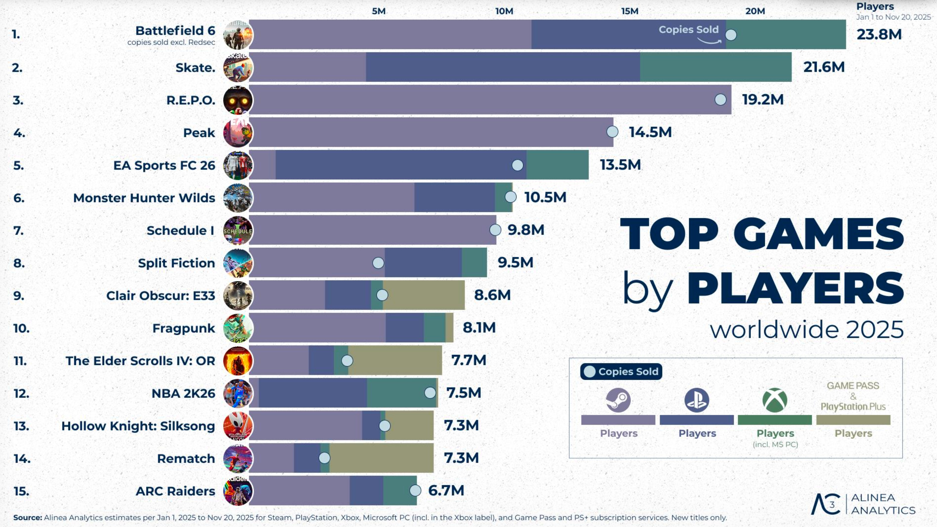 Battlefield 6 was the most successful release by player count (excluding the free-to-play Redsec). 23.8 million players across all platforms purchased the game.
