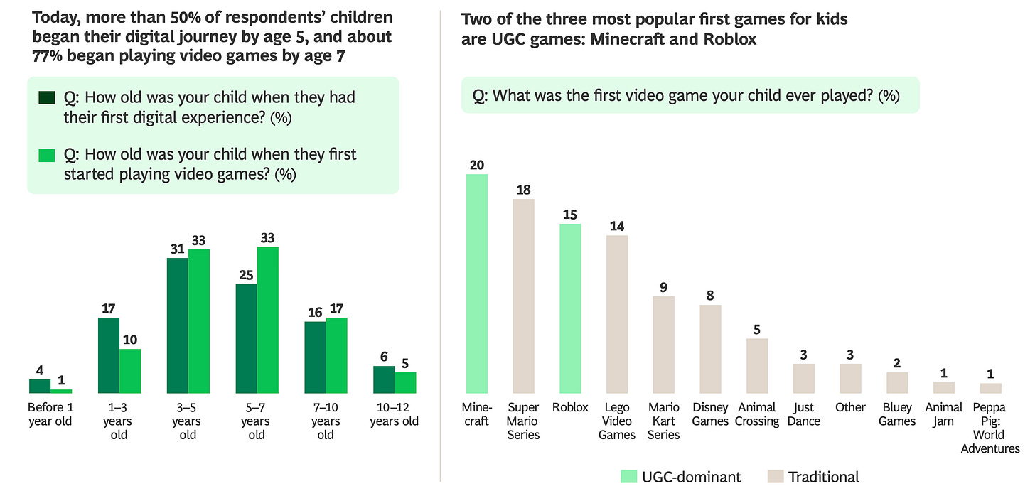 44% of children start playing games before the age of five (survey asked parents who play games themselves). Minecraft, the Super Mario series, and Roblox are the three most common first games for children.