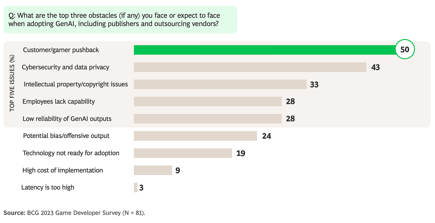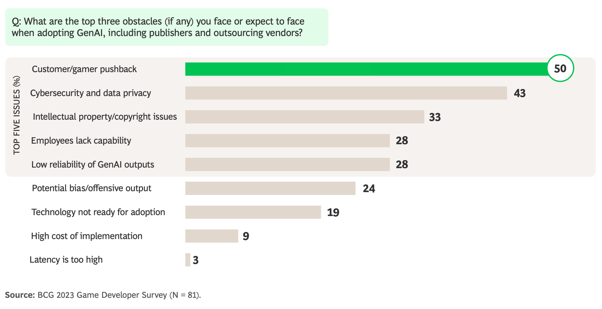 Developers’ main concerns around AI are potential negative audience reactions (50%), cybersecurity issues (43%), and legal risks (33%).
