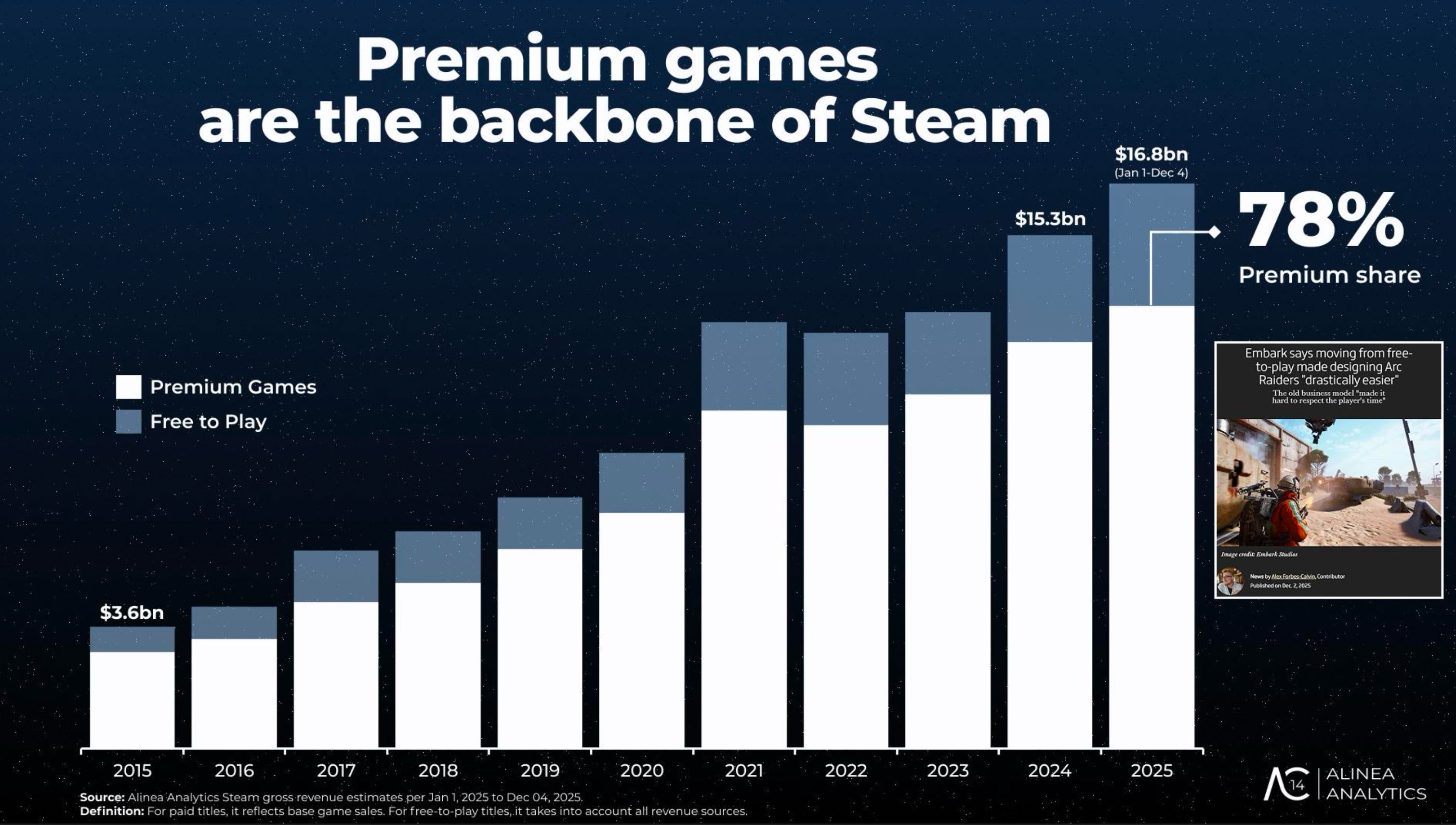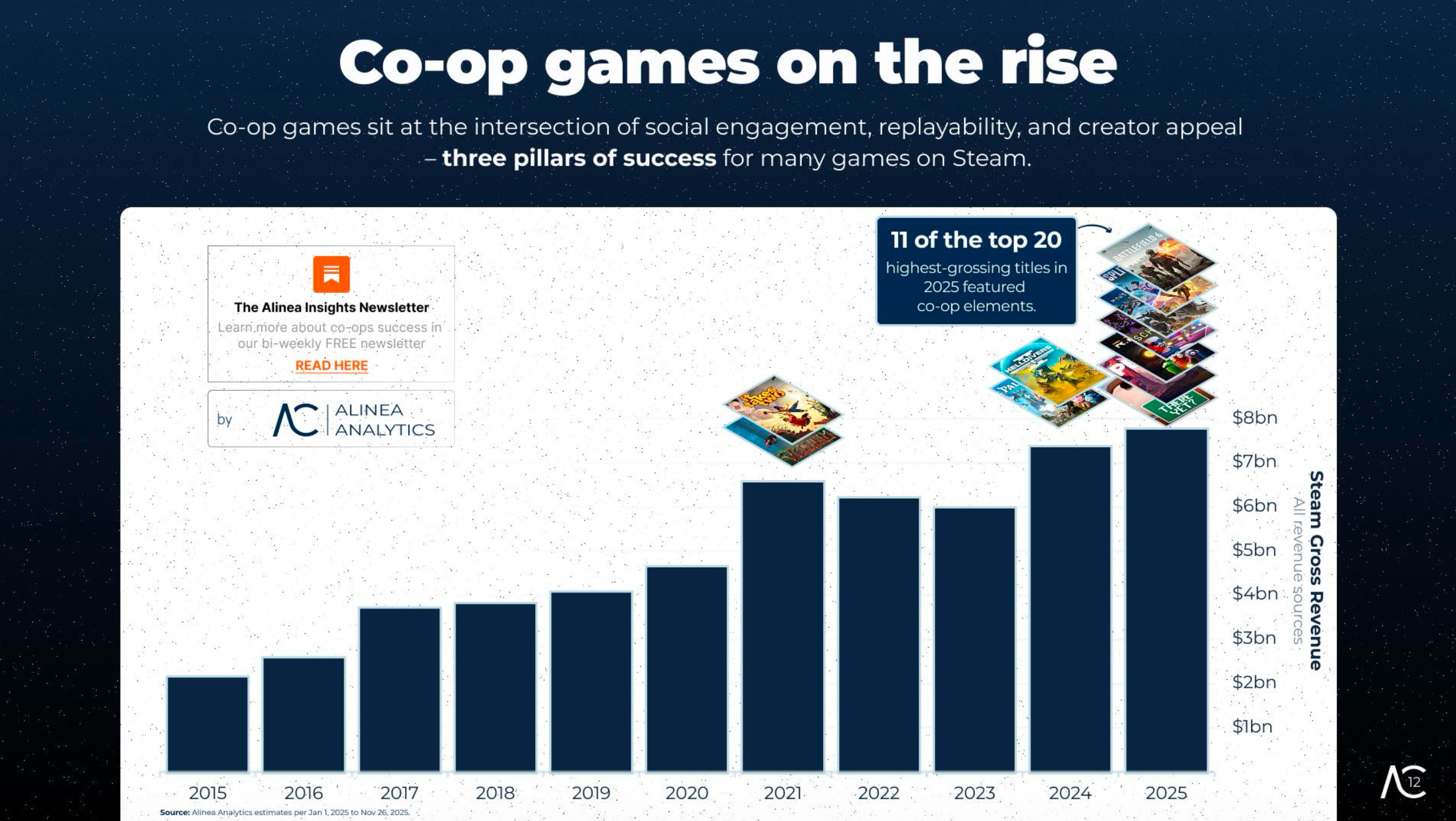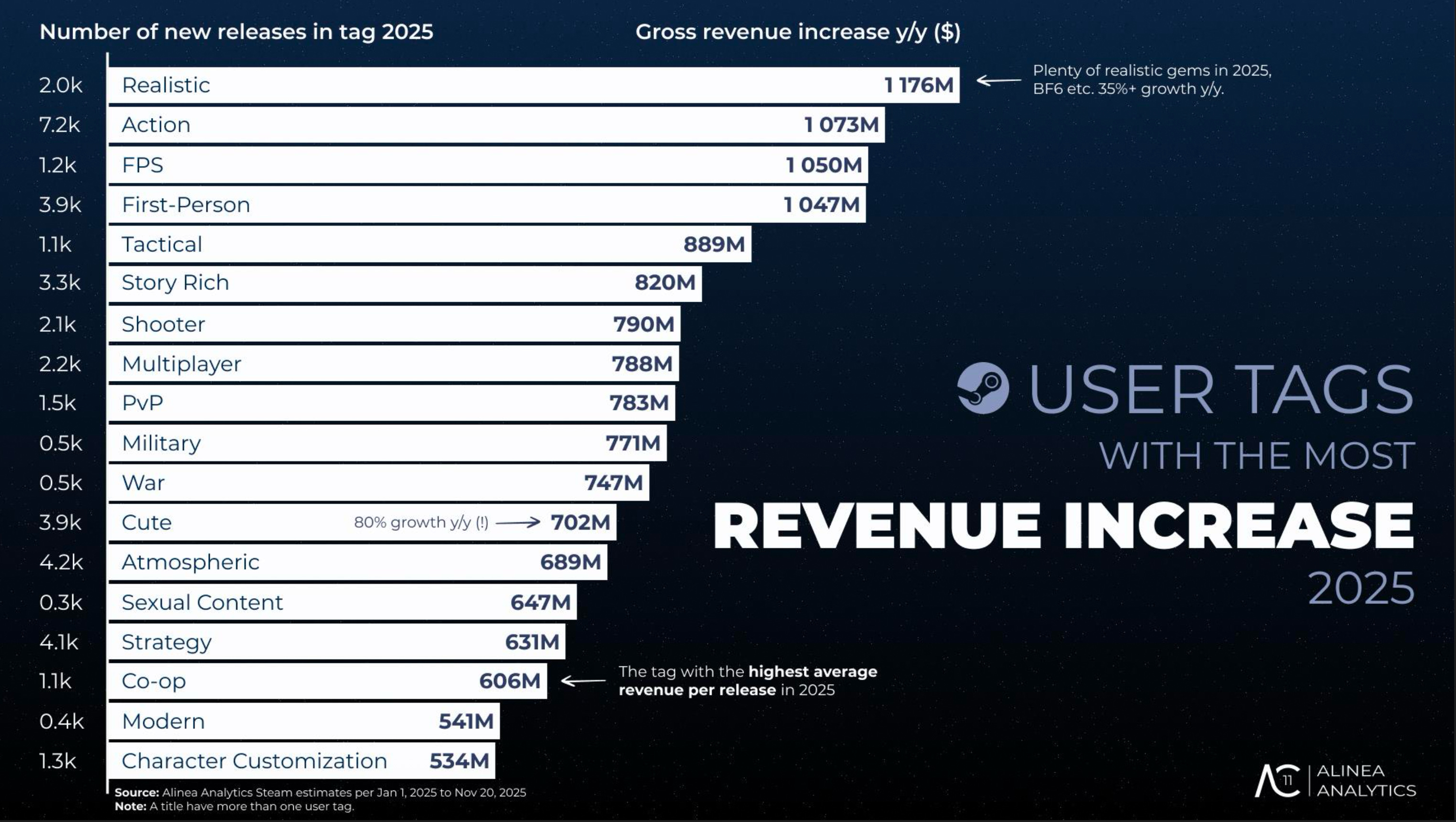 Looking at Steam tags, realistic games showed the strongest revenue growth (with a major contribution from Battlefield 6), followed by action and FPS. Cooperative games (with the relevant tag) showed the highest average revenue in 2025.