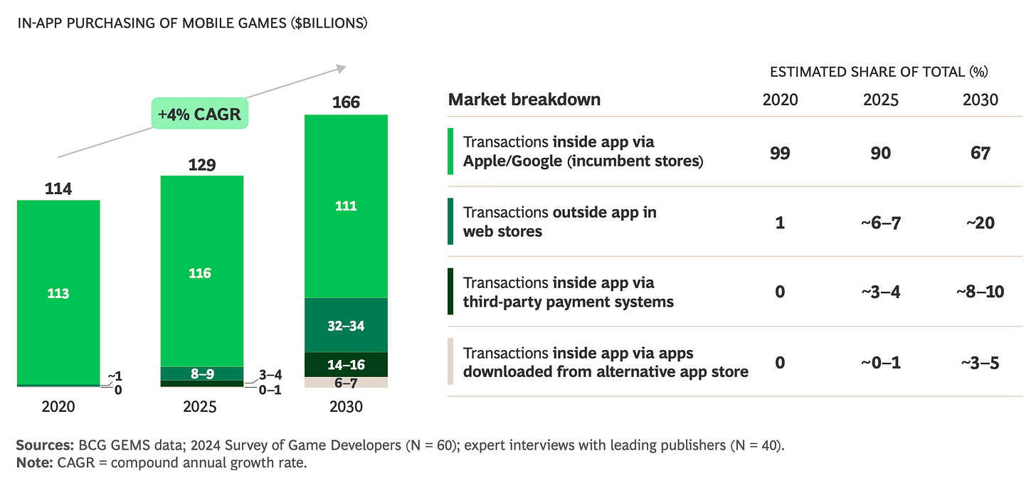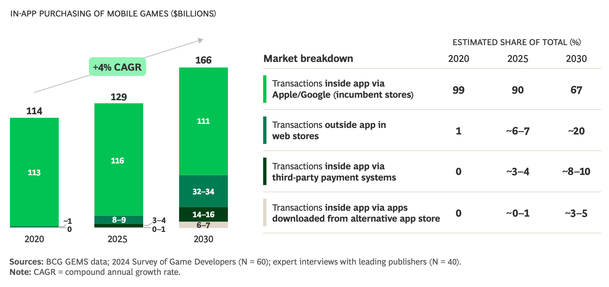 According to BCG, 8–9% of transactions currently go through alternative payment methods (web shops or third-party payments inside apps). By 2030, the share of payments via Google and Apple is expected to drop to 67% (from 90% in 2025).