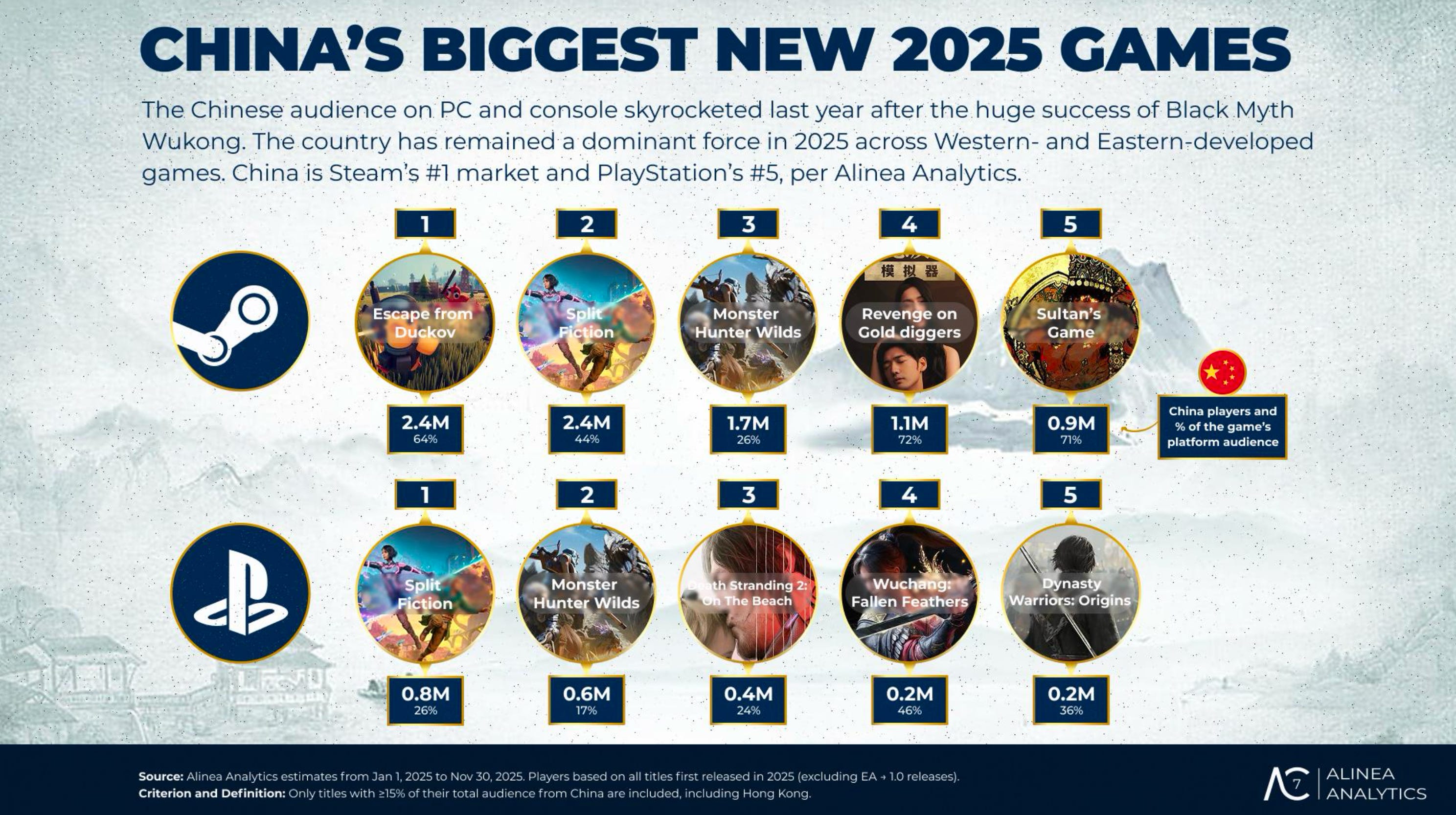 Escape From Duckov (64% of its audience from China), Split Fiction (44%), and Monster Hunter: Wilds (26%) are the biggest Steam hits in China. On PlayStation, the leaders are Split Fiction (26% of the audience from China), Monster Hunter Wilds (17%), and Death Stranding 2: On The Beach (24%).