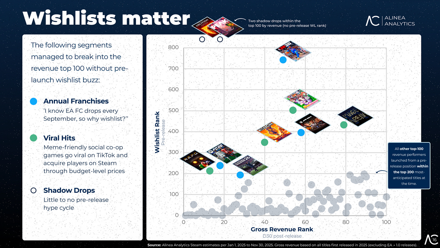 All other projects that made it into the top 100 by revenue in 2025 were at least in the top 200 most-wishlisted games.