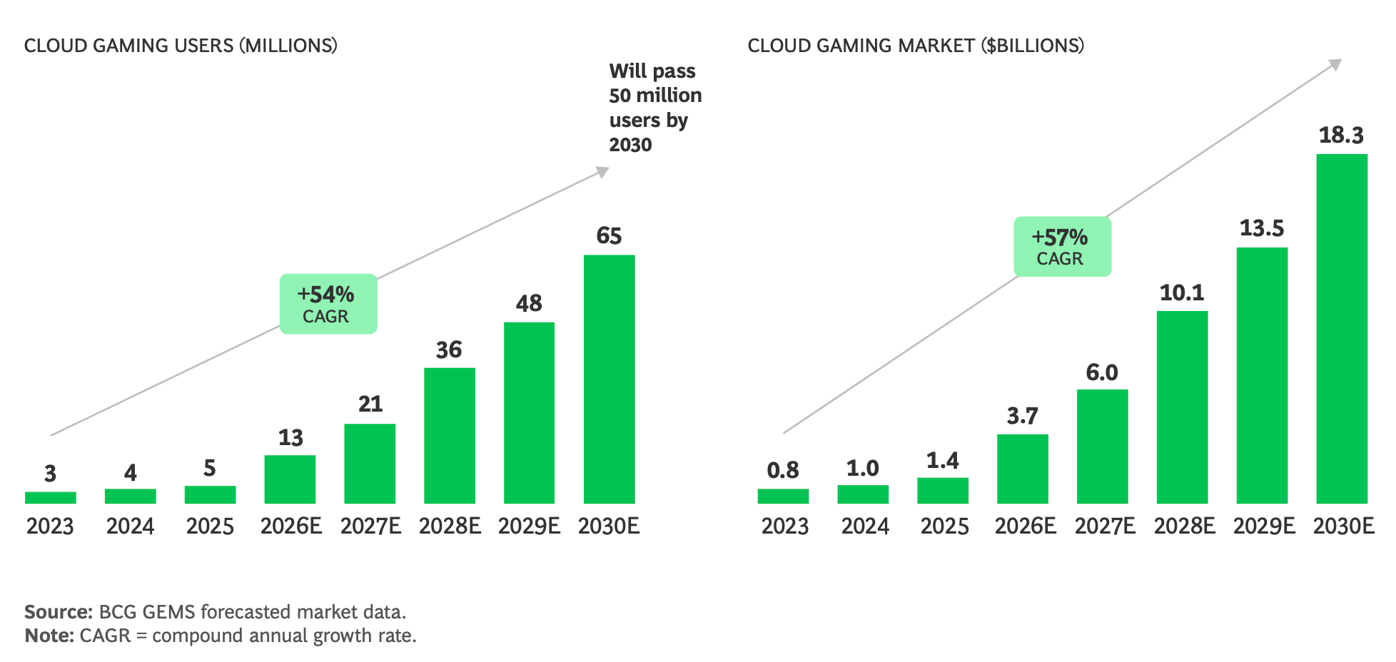 BCG projects significant growth in cloud gaming. Analysts estimate the number of users will grow from 5 million in 2025 to 65 million in 2030 (+54% CAGR), while market size will increase from $1.4 billion to $18.3 billion.