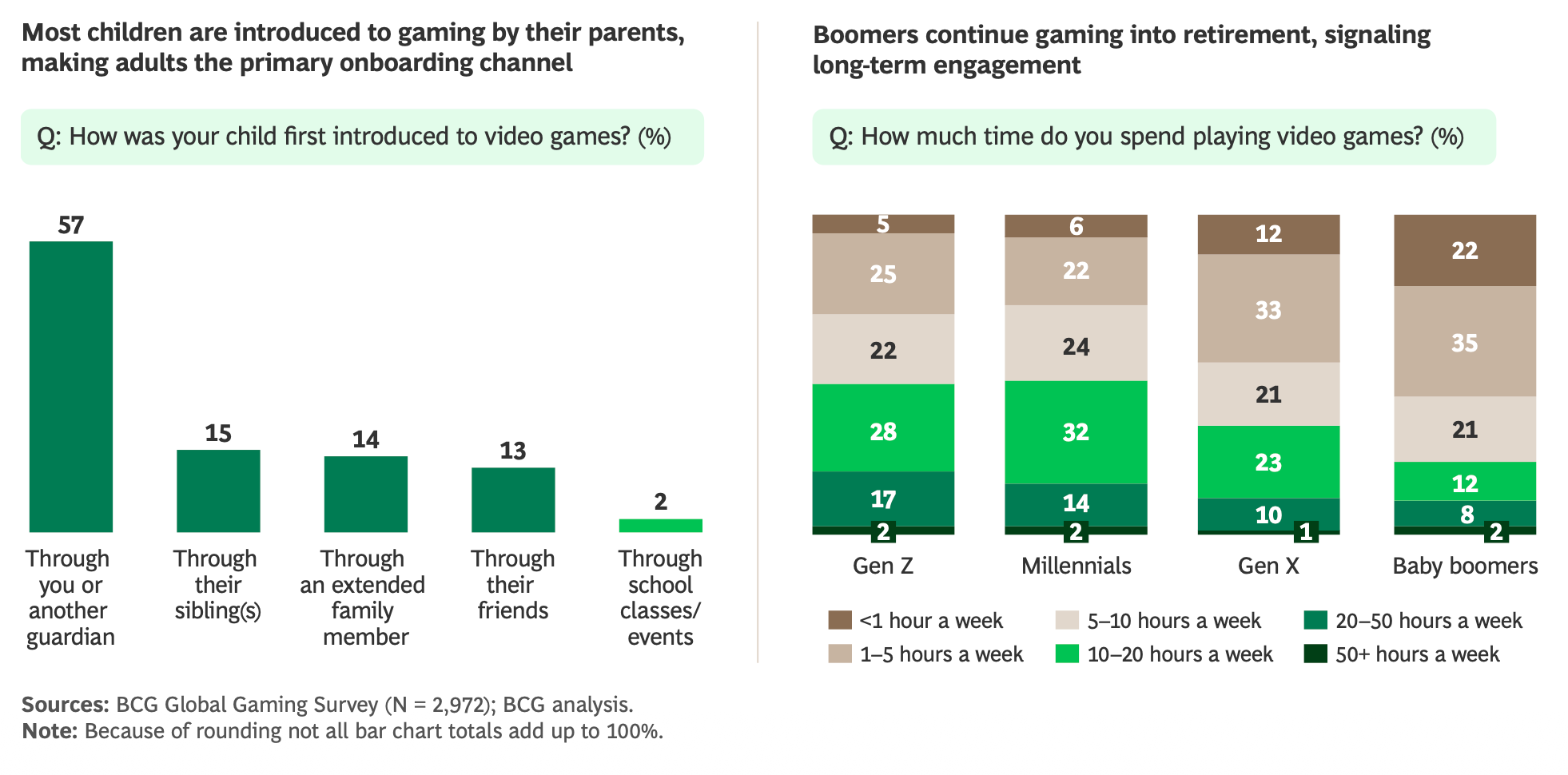 The difference in market size compared with, for example, Newzoo is due to methodology. BCG includes hardware sales and advertising.