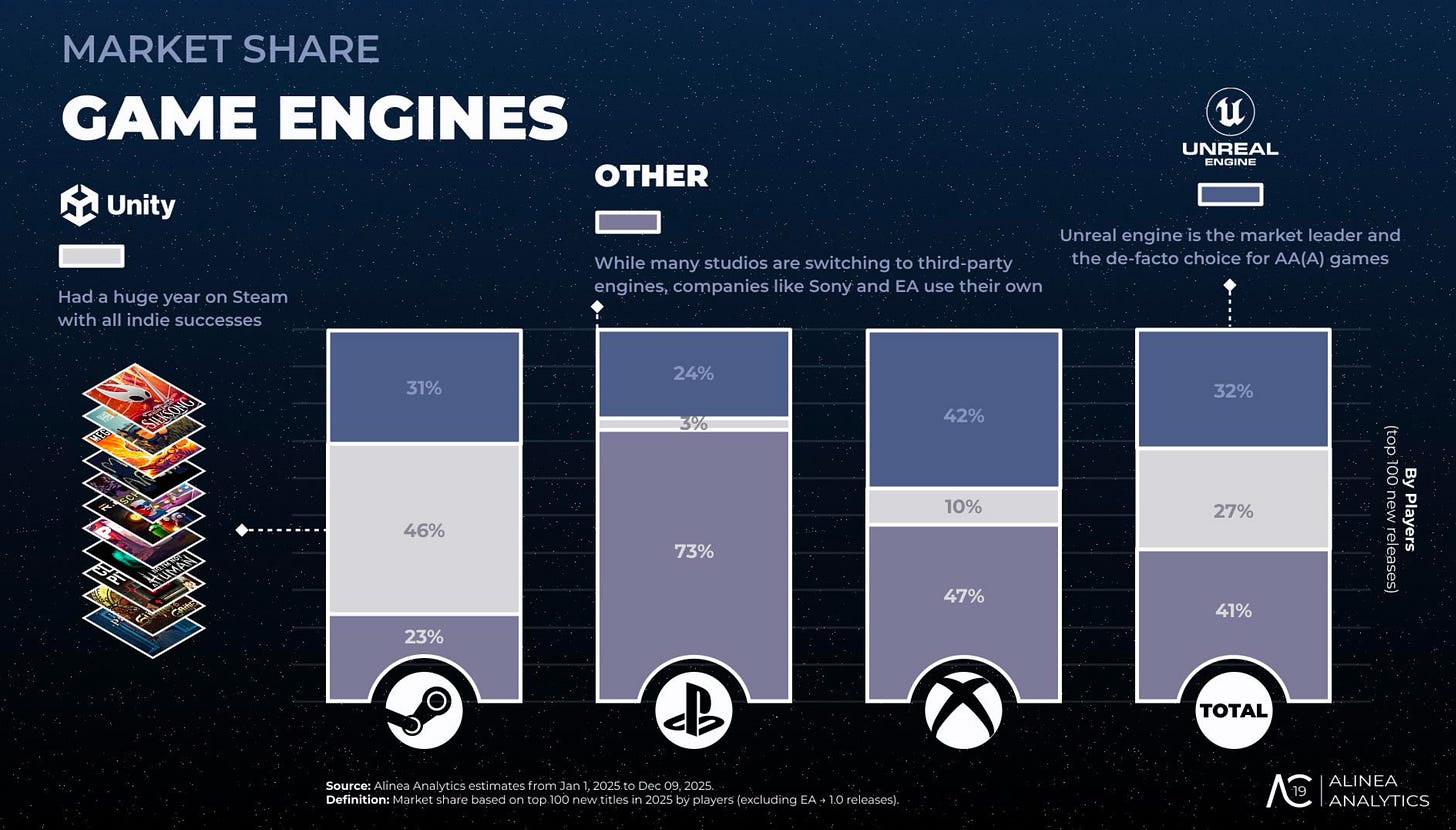 Interestingly, 41% of games in the top 100 were not made using Unity or Unreal Engine. On PlayStation, for example, 73% of the top 100 projects were built on other engines. On Steam, Unity performs particularly well, largely due to its popularity among indie developers.
