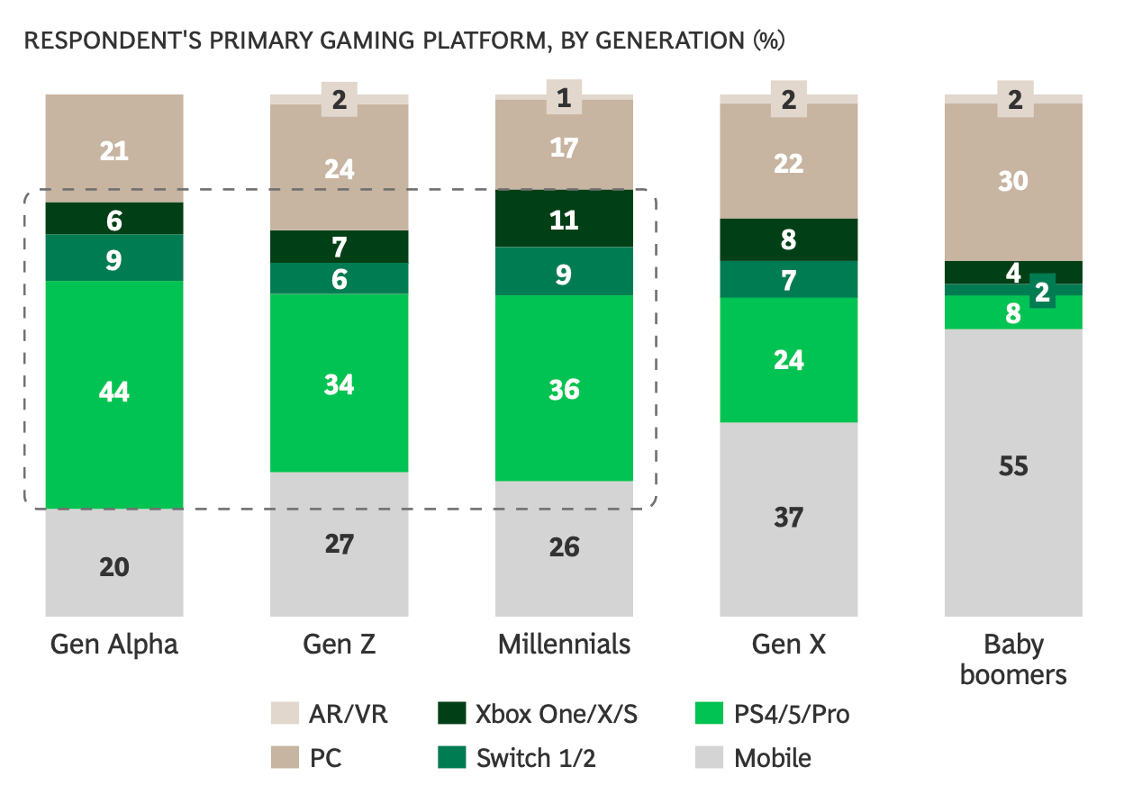 Consoles are the primary platform (where users spend the most time) for more than 50% of Gen Alpha, Gen Z, and millennials.