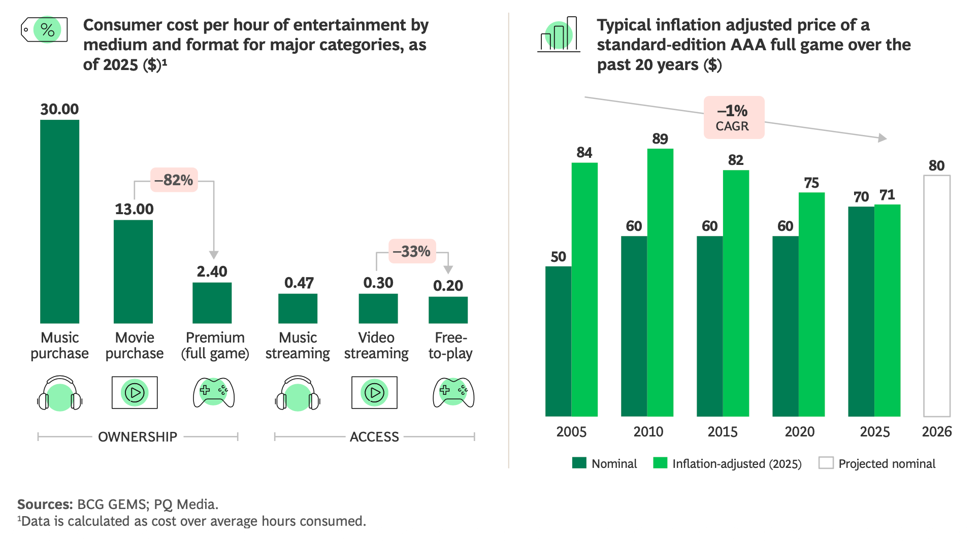 BCG notes that despite rising nominal game prices, inflation-adjusted prices are actually declining. Game prices peaked in 2010.