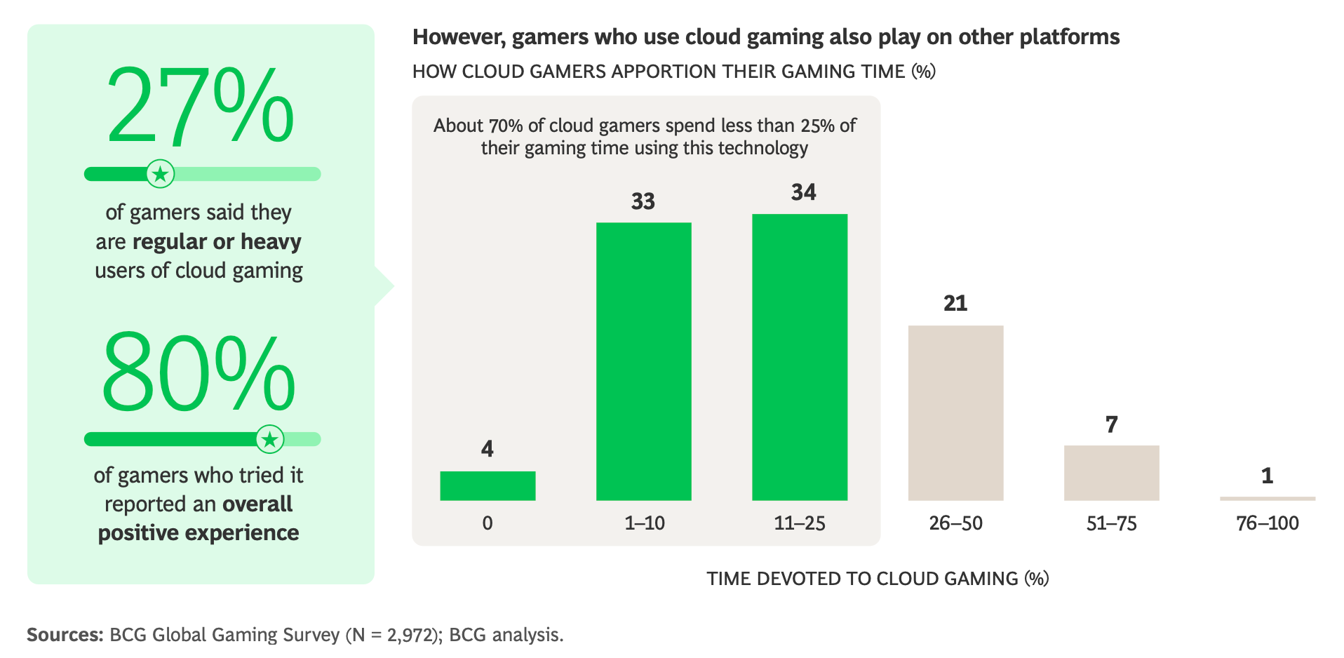 80% of those who have tried cloud gaming were satisfied, but only 8% play primarily via cloud (more than 50% of their total playtime).