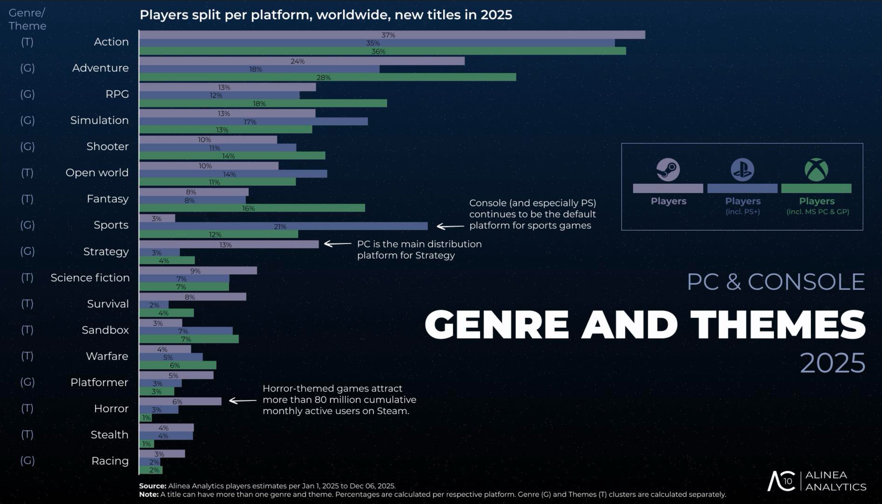 Action, adventure, and RPG are the top three genres by total player count among new releases. There are exceptions: sports games rank second in popularity on consoles, while strategy games perform better on Steam.