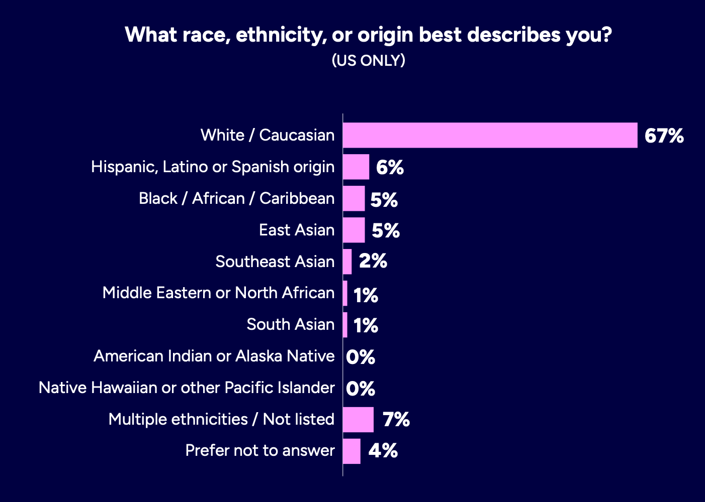 Among U.S. respondents, 67% identify as White/Caucasian, making it the dominant racial/ethnic/origin group.