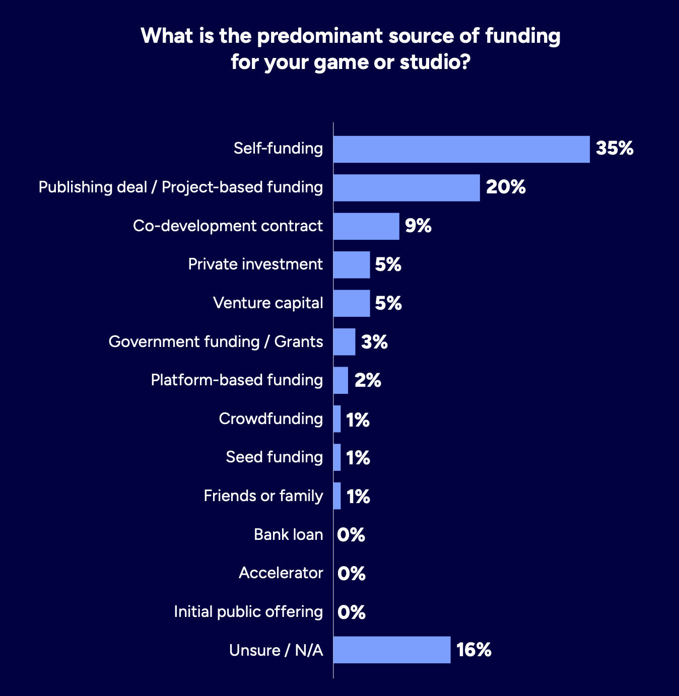 35% of developers are self-funded. 20% rely on publishing deals or project-based financing.