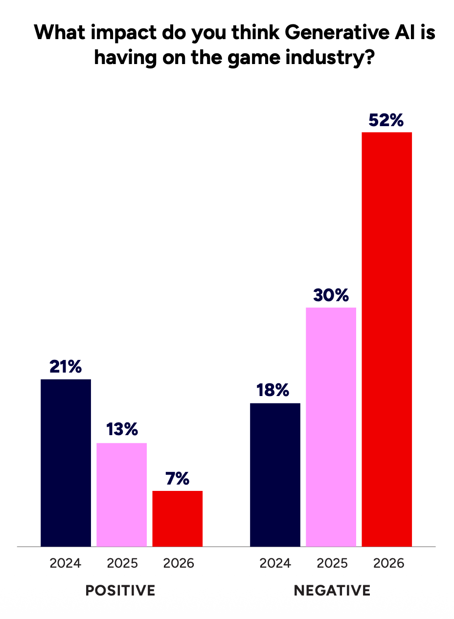 An increasing share of respondents believe AI harms the game industry. 52% this year reported a negative view of AI.