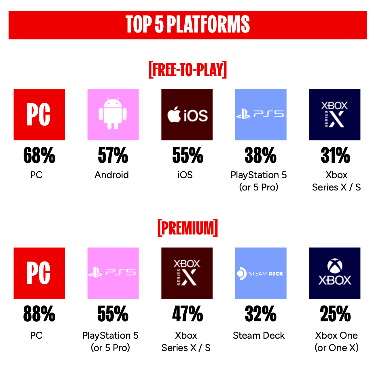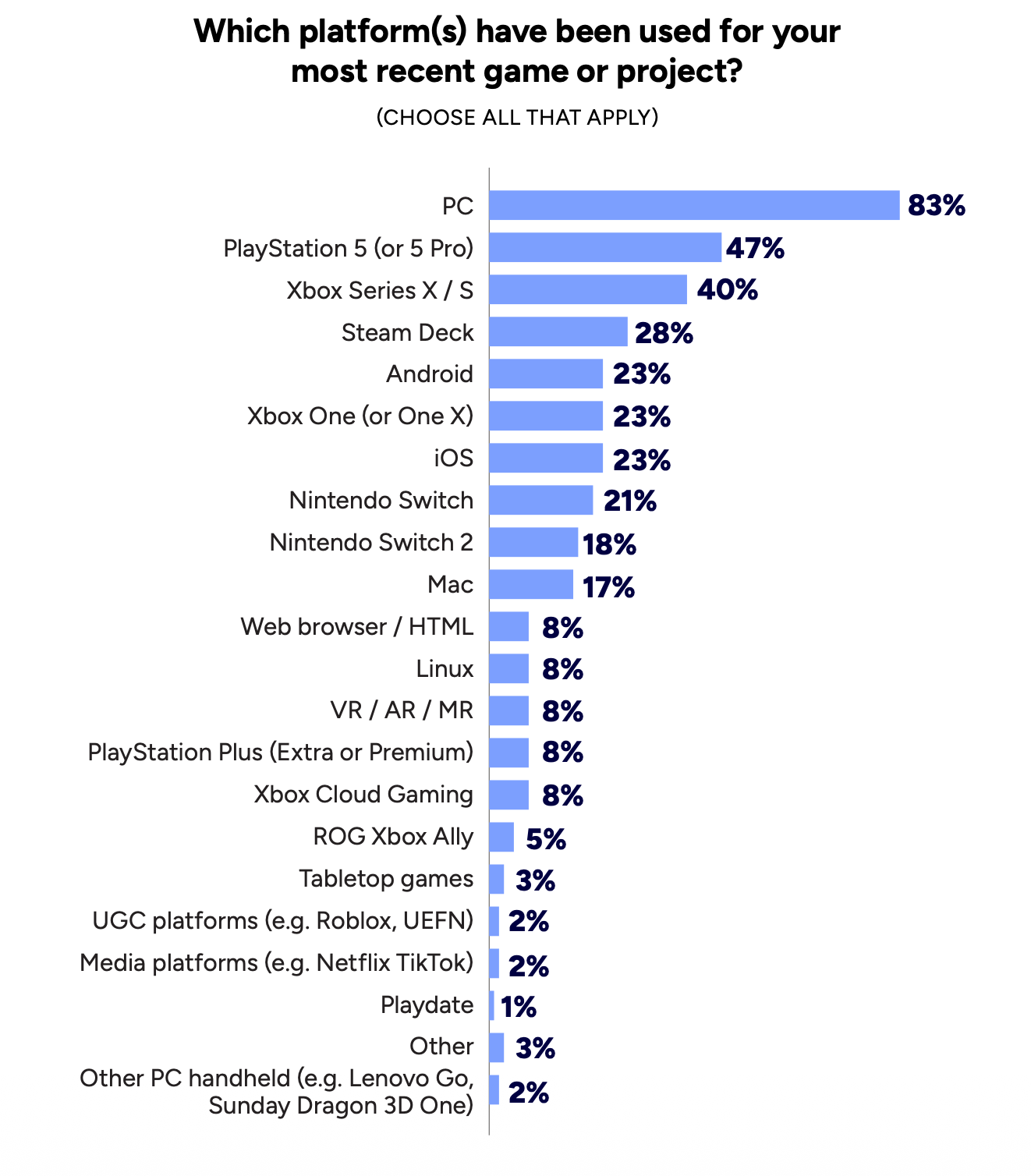 PC at 83%, PS5 at 47%, Xbox Series S|X at 40%, Steam Deck at 28%, Android or iOS at 23%, and Xbox One at 23% were the platforms used for respondents’ most recent projects.