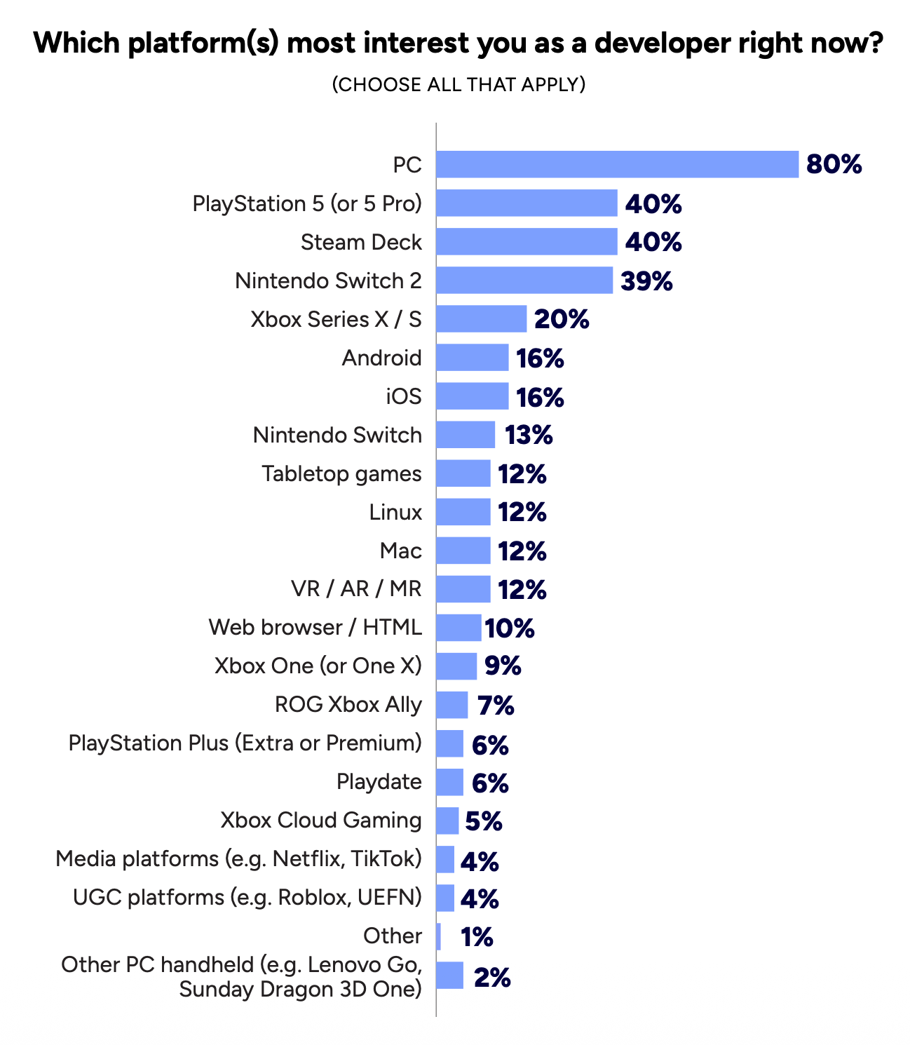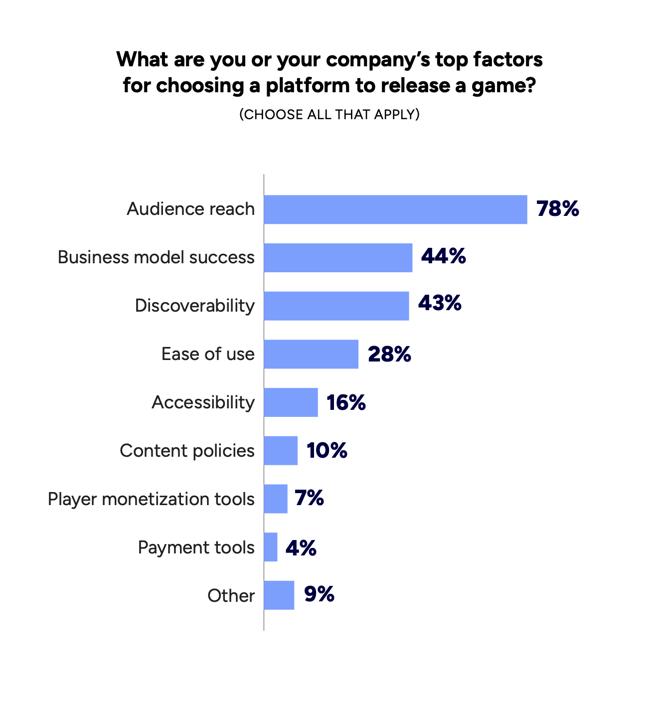 When choosing platforms, developers prioritize audience access (78%), business model success on the platform (44%), and discoverability (43%).