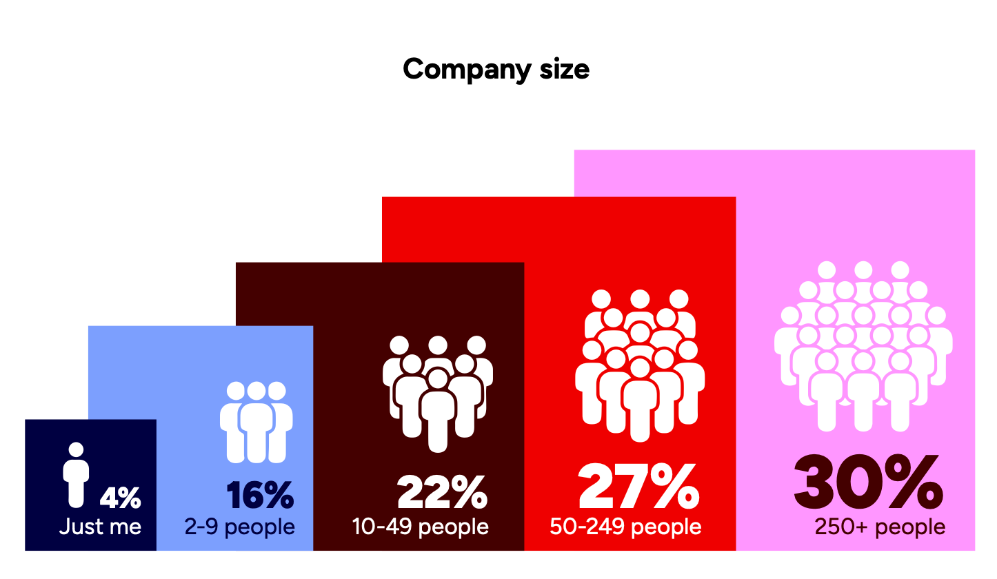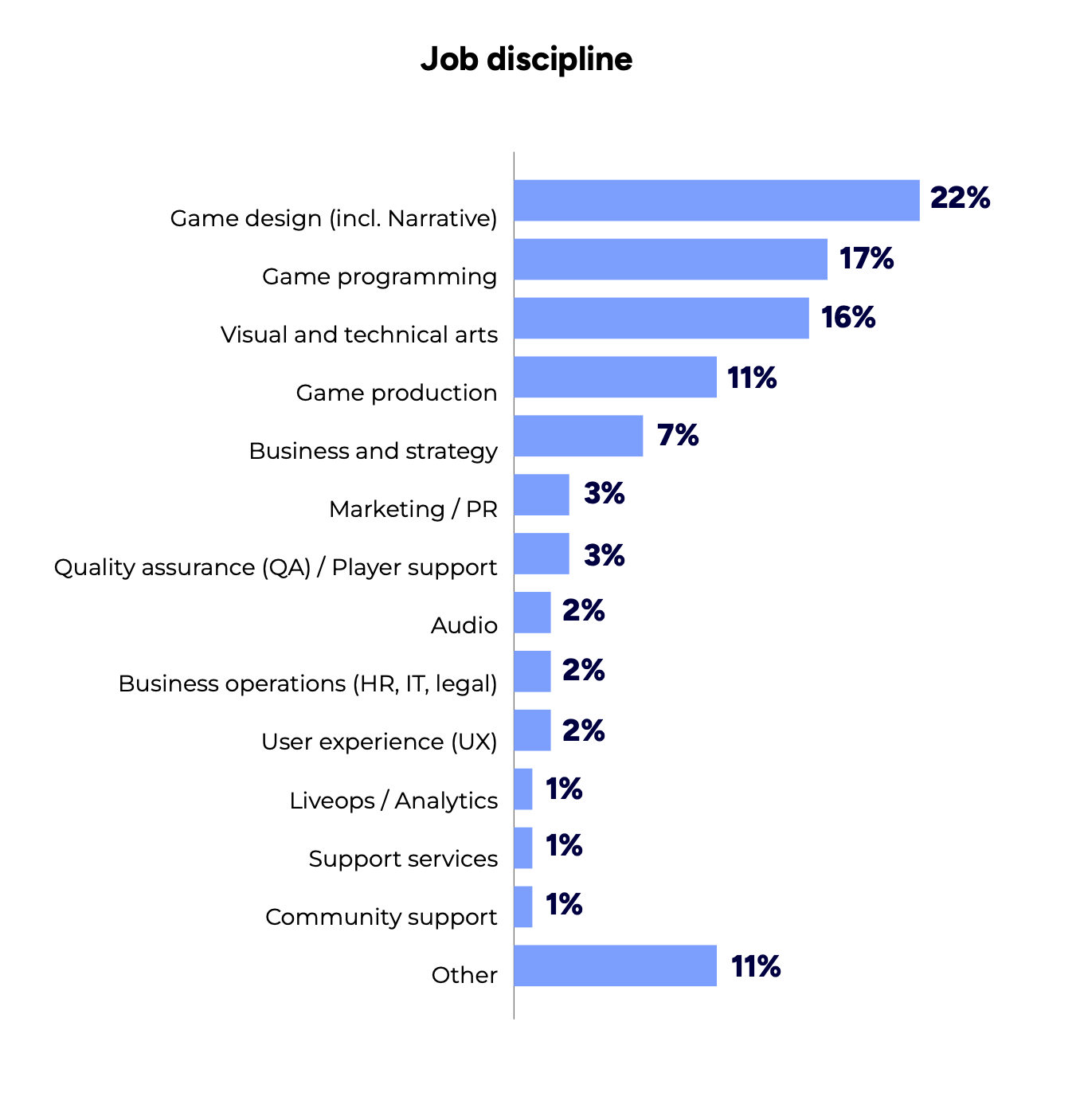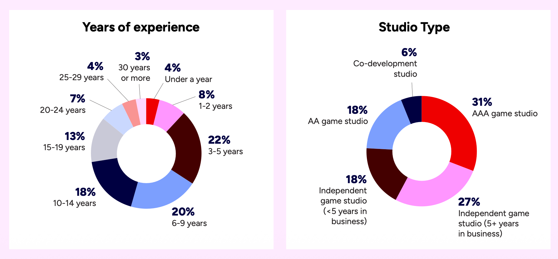 The authors of the survey aimed to maintain a balanced proportion between newcomers and industry veterans. Studios of different sizes are also well represented in the sample.