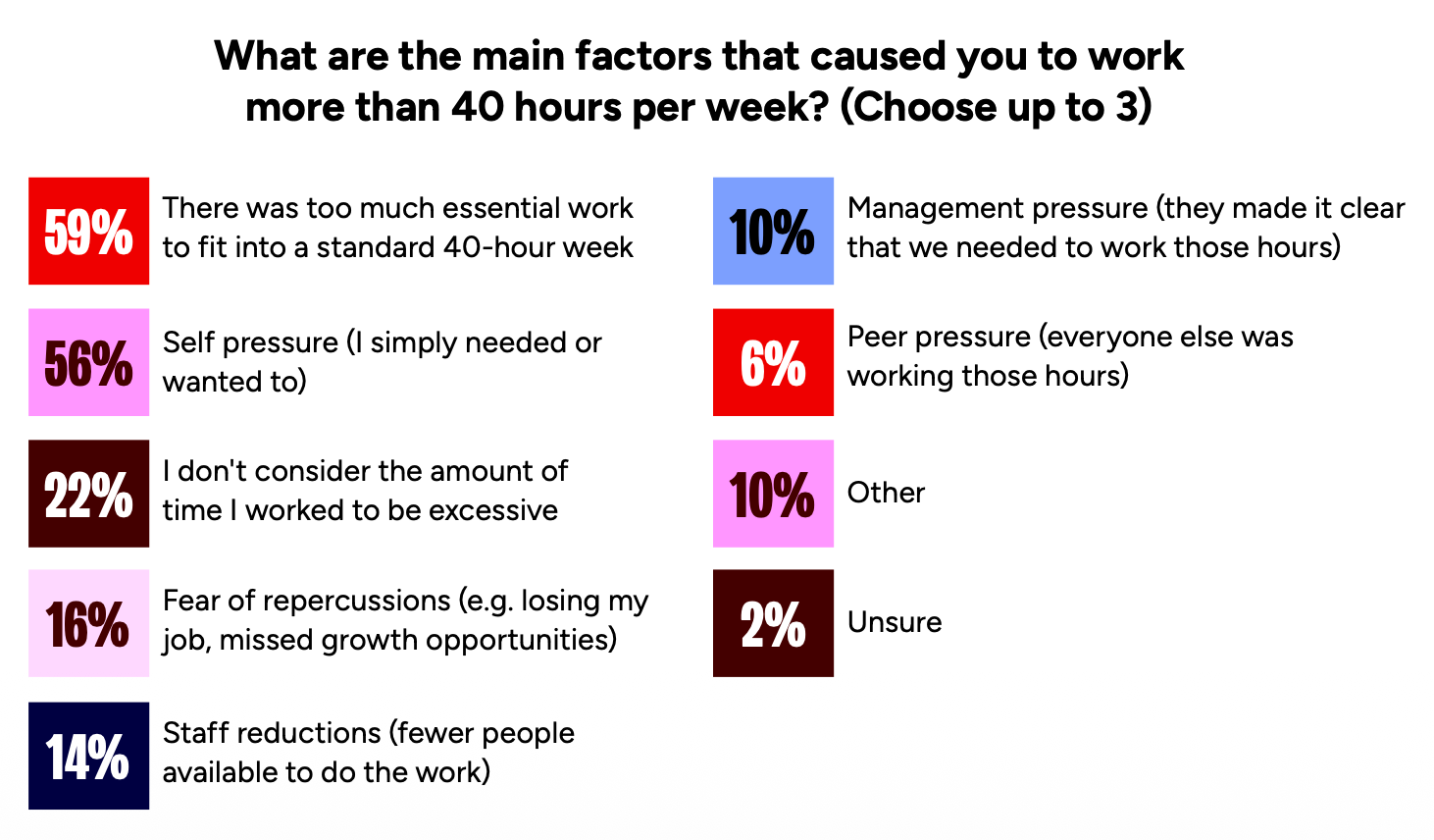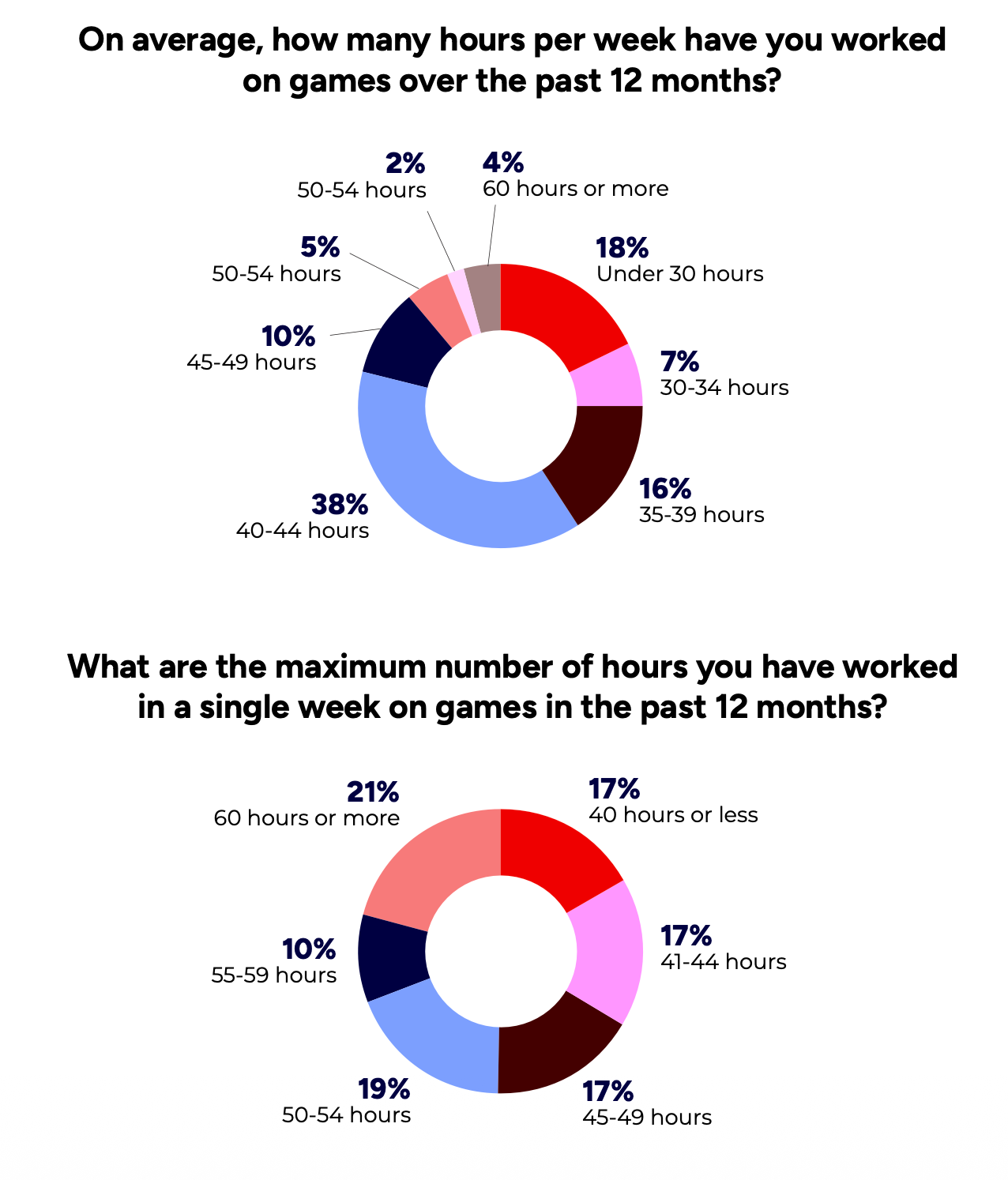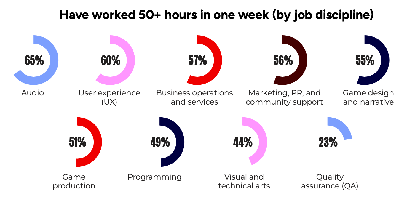 Among those claiming to work more than 50 hours per week, the highest shares are in audio (65%), UX (60%), and business operations (57%).