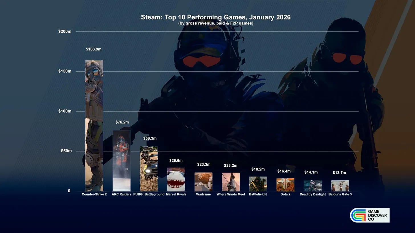 Counter-Strike 2 led revenue rankings by a wide margin with $163.9 million in January. ARC Raiders followed with $76.2 million, and PUBG: Battleground took third place with $56.3 million.
