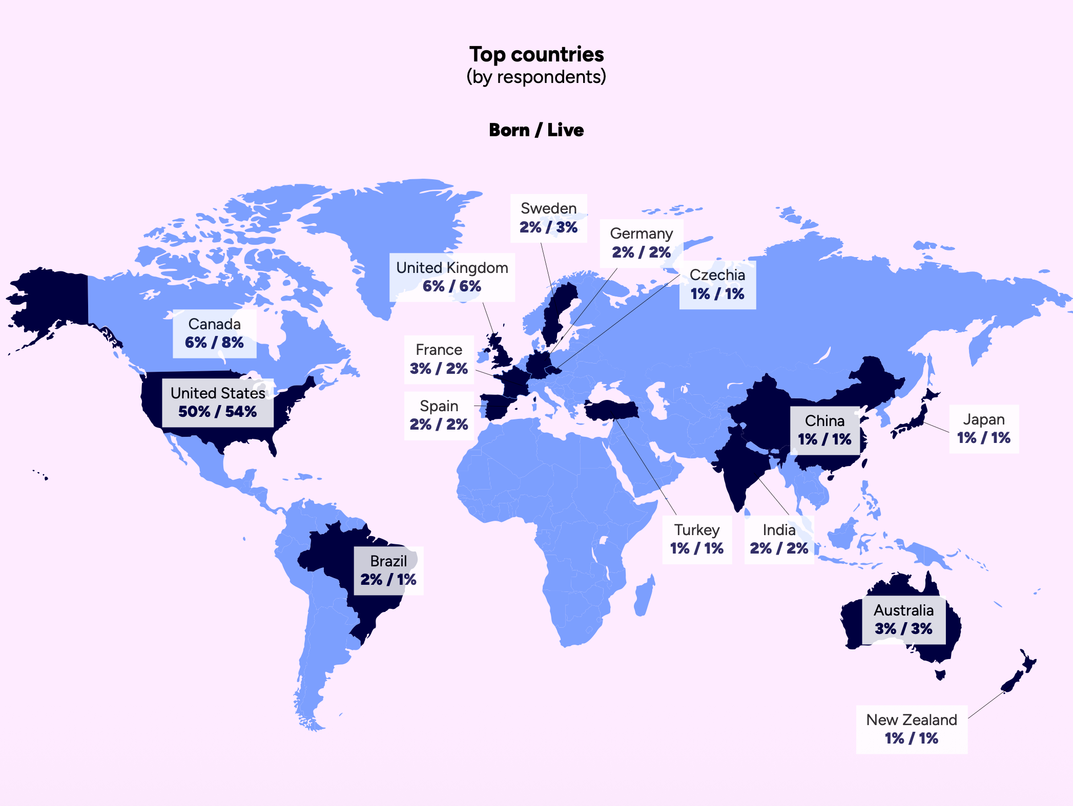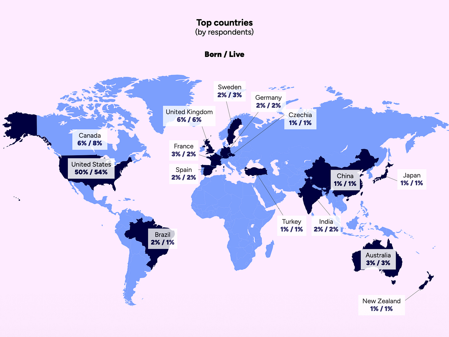 The majority of respondents are from the United States. 50% were born there, and 54% currently live there. More than 90% of respondents represent North America and Europe.
