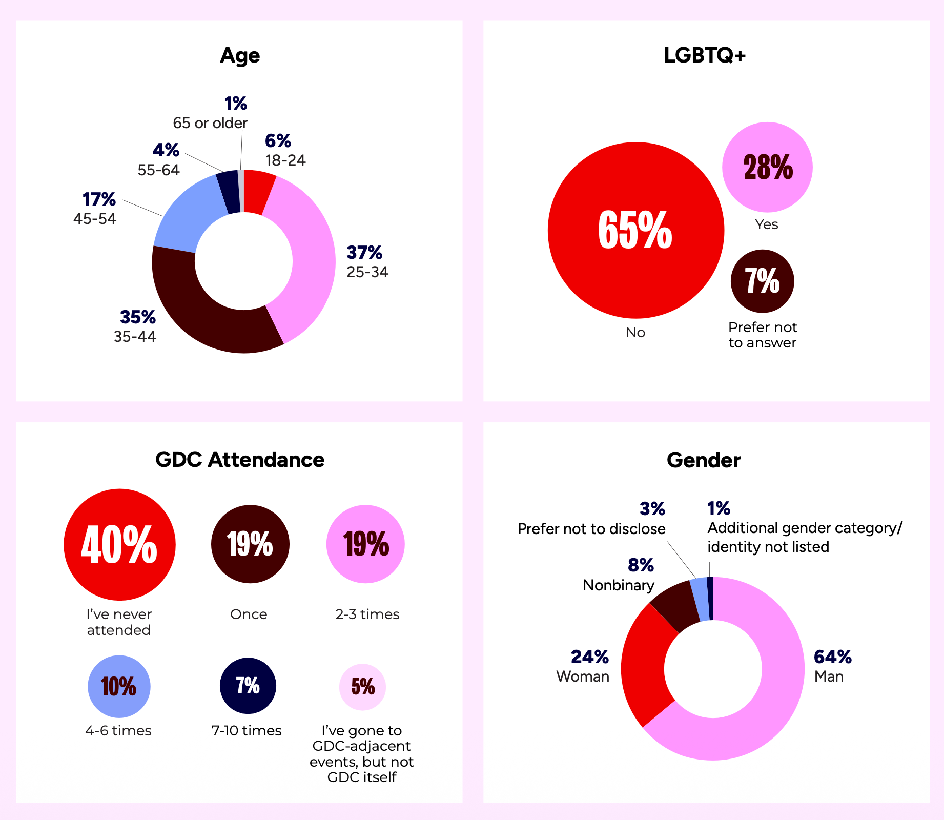 72% of respondents are aged between 25 and 34. 40% have never attended GDC before. 64% are men, 24% are women.
