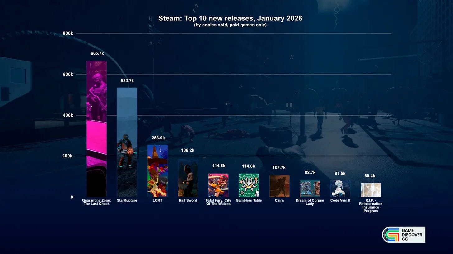 No Rest for the Wicked is worth highlighting separately. The game sold 663.3 thousand copies in January, bringing total sales to 1.5 million, following the release of its cooperative mode.