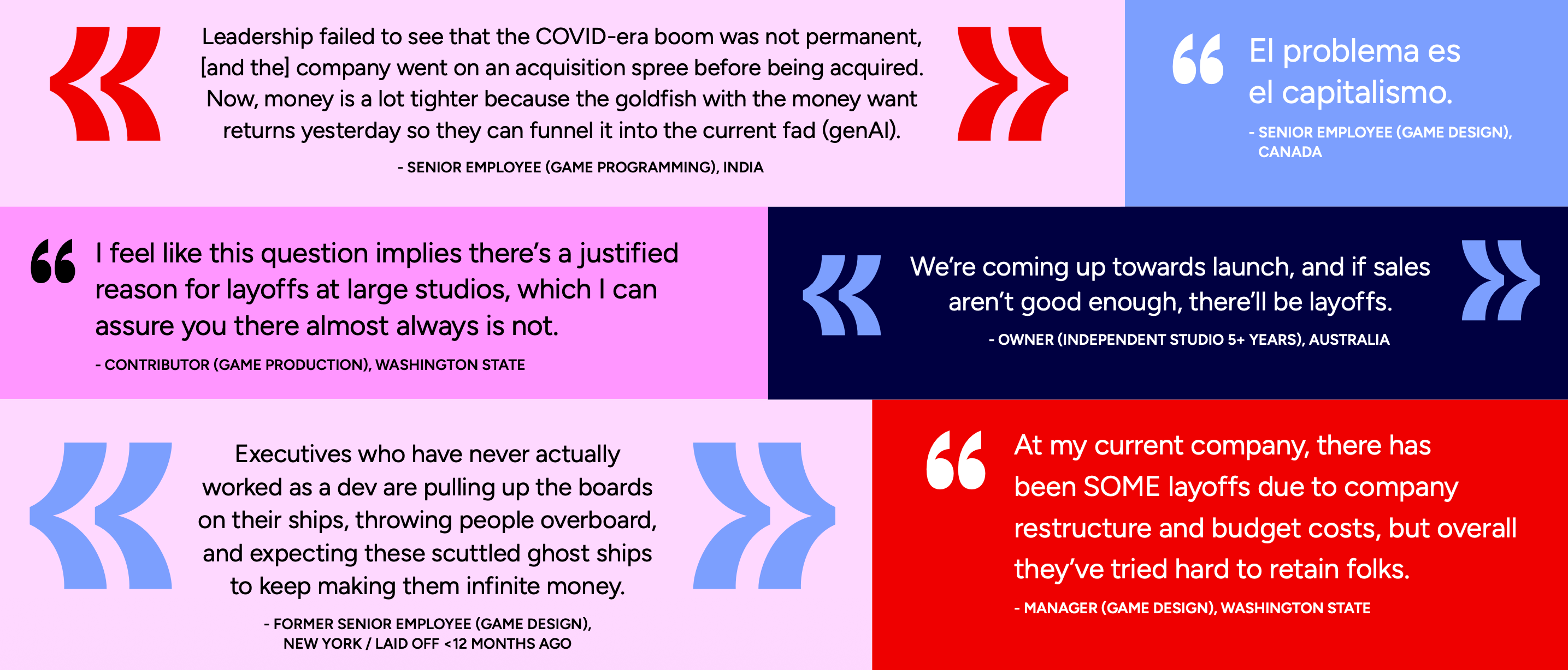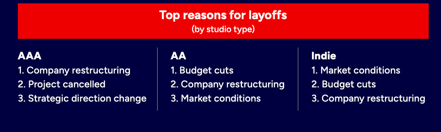 AAA studios appear to be under the greatest pressure. Two-thirds of employees at AAA companies reported either being laid off themselves or seeing colleagues laid off.