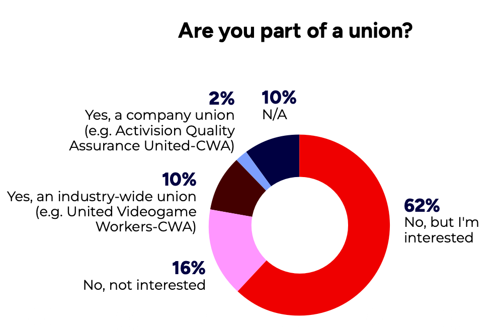 82% support the formation of unions in the game industry. Support is strongest among those earning up to $200,000 per year, those who were laid off in the past two years, and respondents under 45.