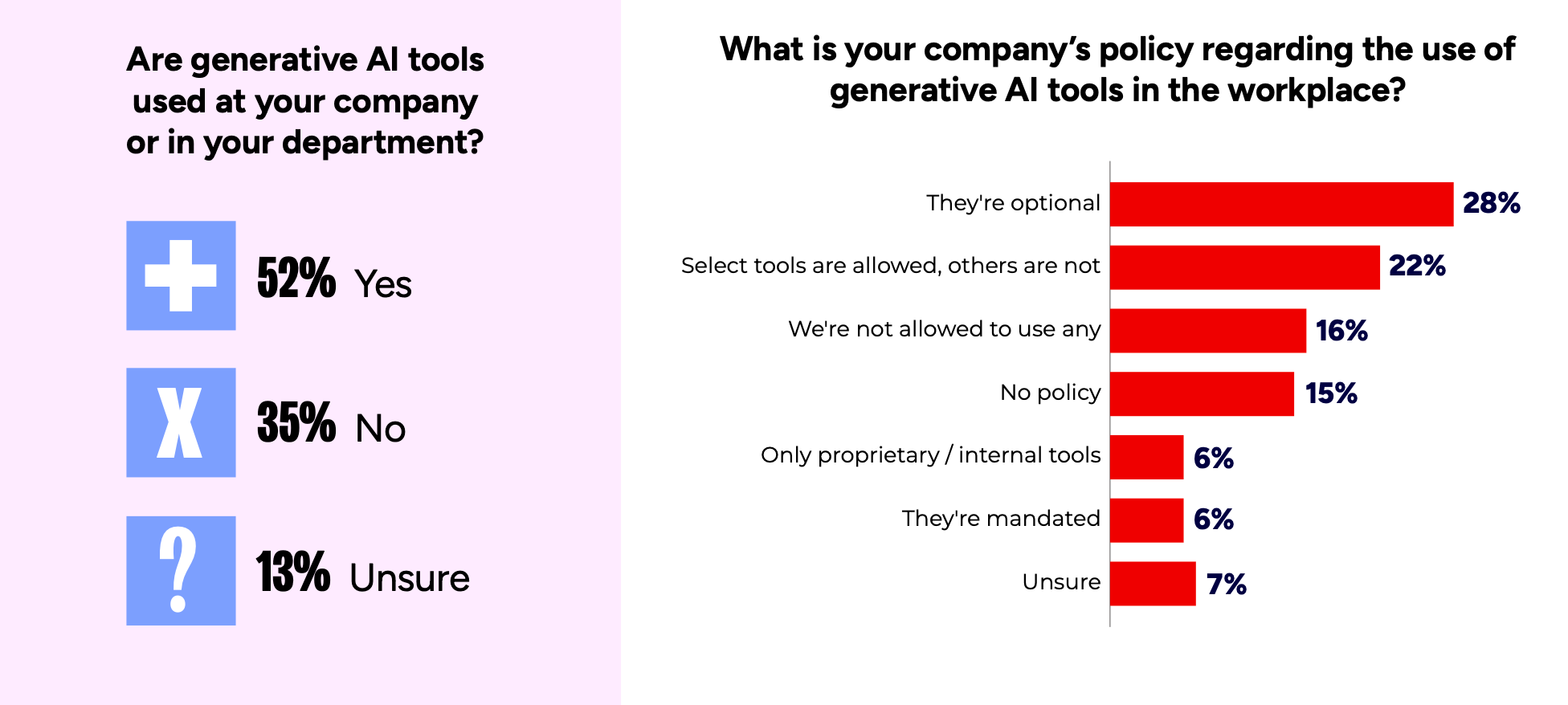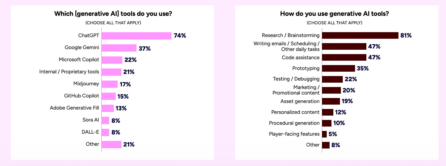 The most common use cases are research and brainstorming (81%), writing emails and planning meetings (47%), coding (47%), and prototyping (35%).