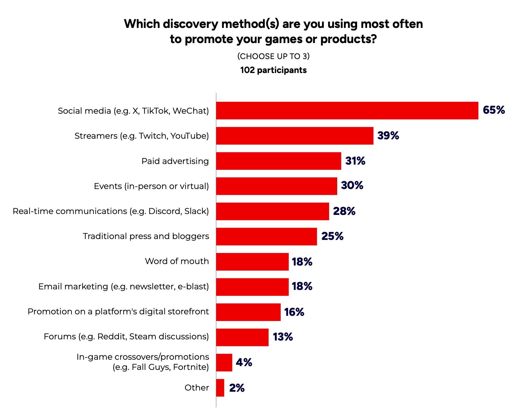 For marketing, the main user acquisition channels are social media (65%), streamers (39%), paid advertising (31%), events (30%), community platforms (28%), and traditional press and bloggers (25%).