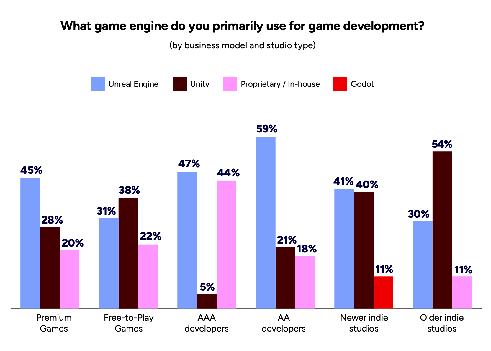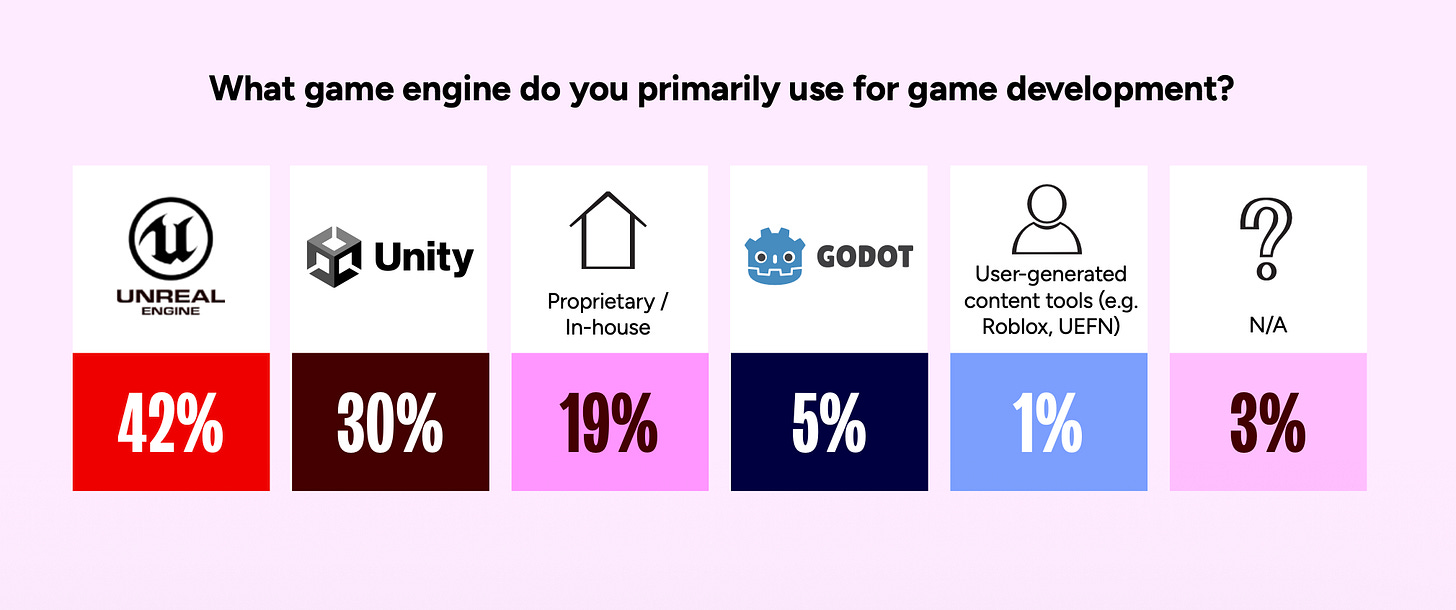 Unity is most popular among F2P projects and smaller teams. Unreal Engine is more common in B2P, AA, and AAA development.