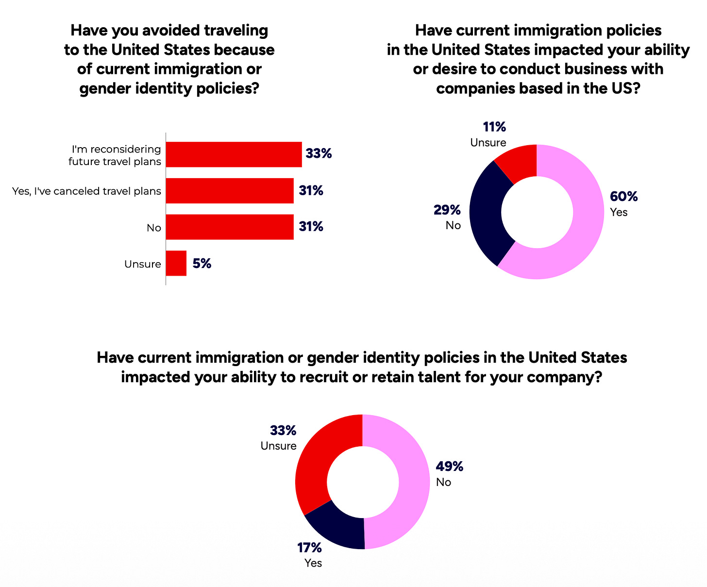 31% of respondents living outside the U.S. have already canceled trips to the country. Another 33% plan to do so.