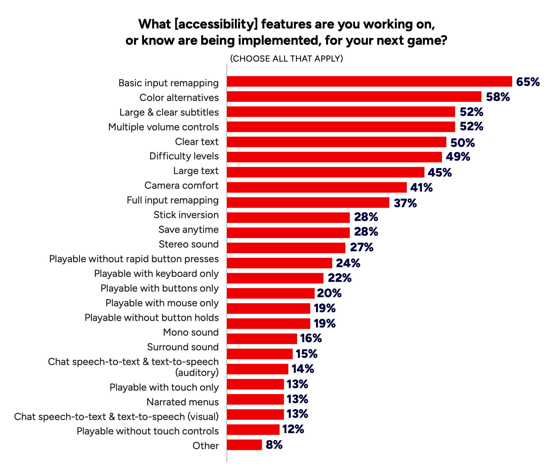 One third of developers add accessibility features to their games. The most common options are button remapping (65%), color settings (58%), larger subtitles (52%), and audio settings (50%).